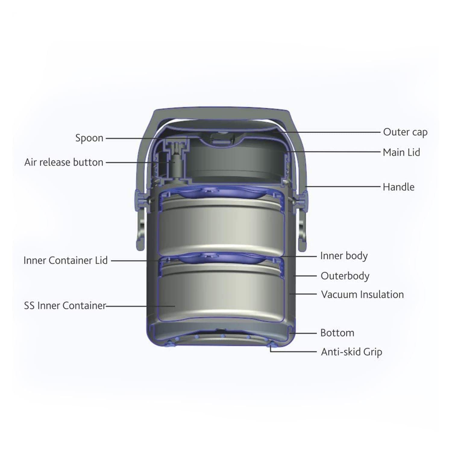 - Premium Stainless Steel Build – Comes with SS 304 grade food containers and a dual wall insulated outer body (Inner: SS 304, Outer: SS 201) for unmatched durability and hygiene.