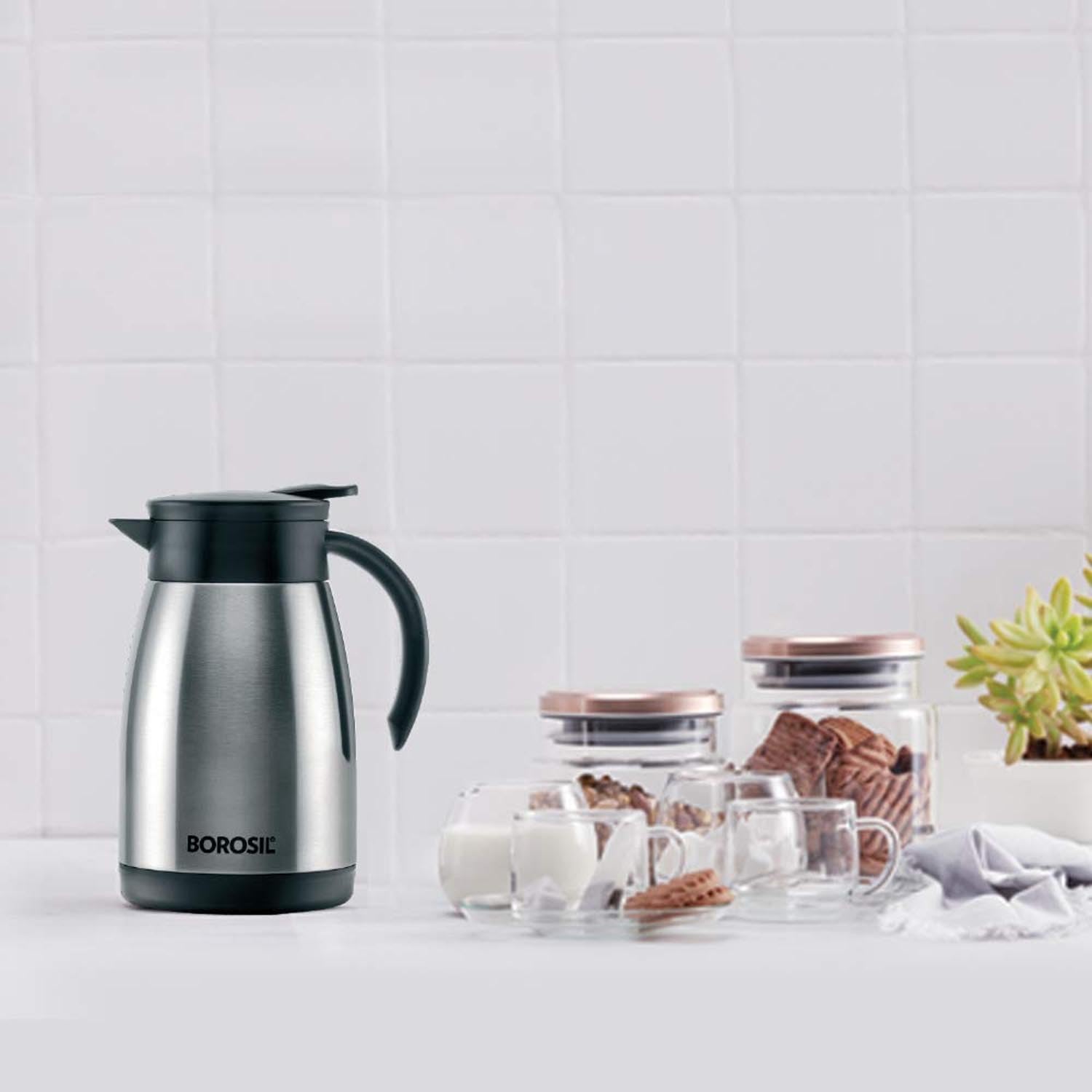 Borosil Stainless Steel 1500ml Teapot with Handle | Double Wall Vacuum Insulated Thermosteel Carafe | BPA Free Jug for Tea/Coffee & Juice | 18 Hours Hot & 24 Hours Cold | 1 Year Warranty, Silver