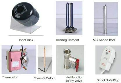 - Includes: 1 N storage electric water heater , 1 N user manual , 1 N multi-function safety valve , 2 N fasteners & 2 N flexi pipes