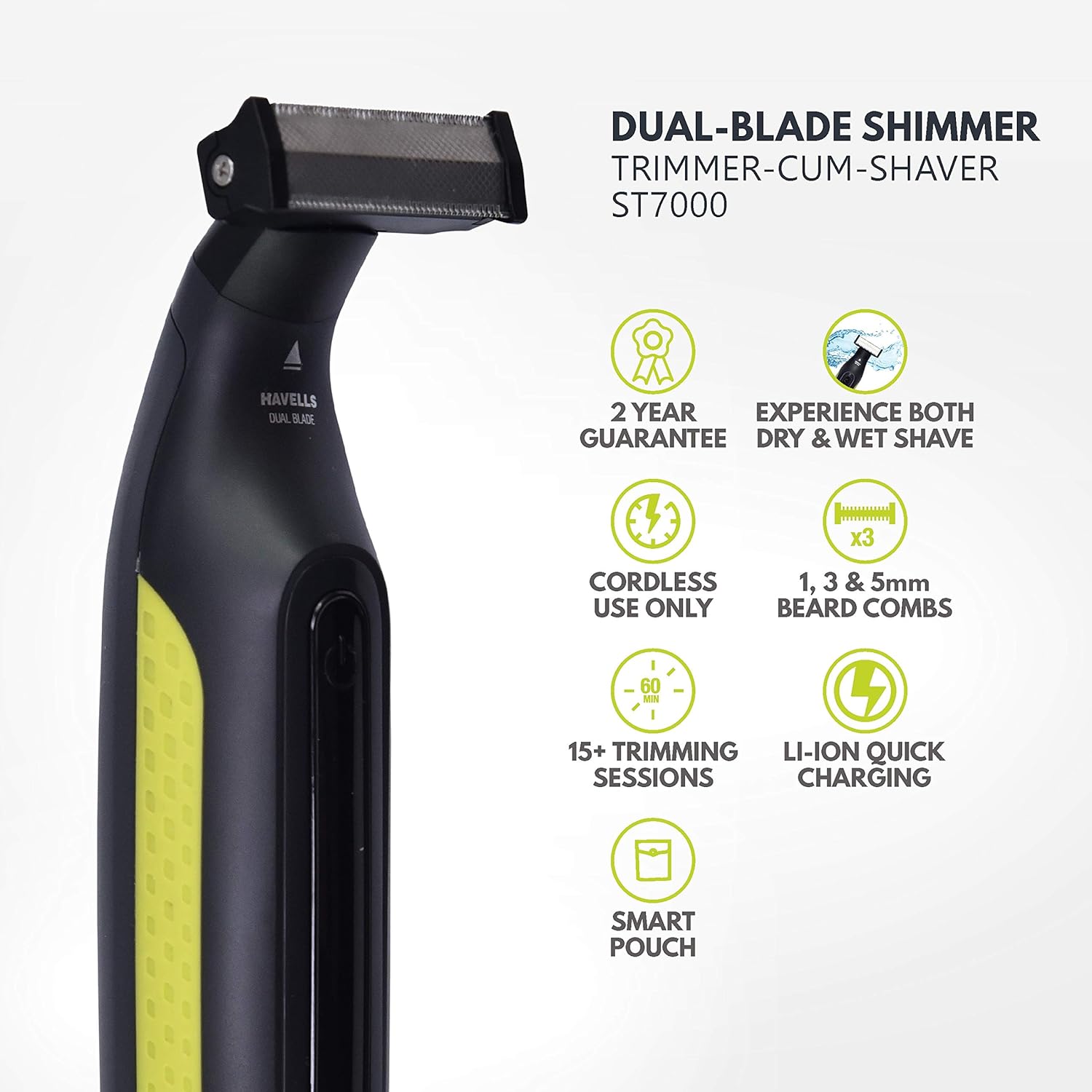 Havells UniBlade (Shaver cum Trimmer) | Rechargeable battery | 60 minutes Runtime | For Wet and Dry shave (IPX6) | 3 Trimming Combs | Travel friendly pouch | Black and Yellow | ST7000