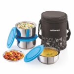 CELLO MF Thermostyle Stainless Steel 3 Container with Jacket| Leakproof Lunch Boxes | Easy to Clean | Ideal for College, Office | 4 Unit, Blue