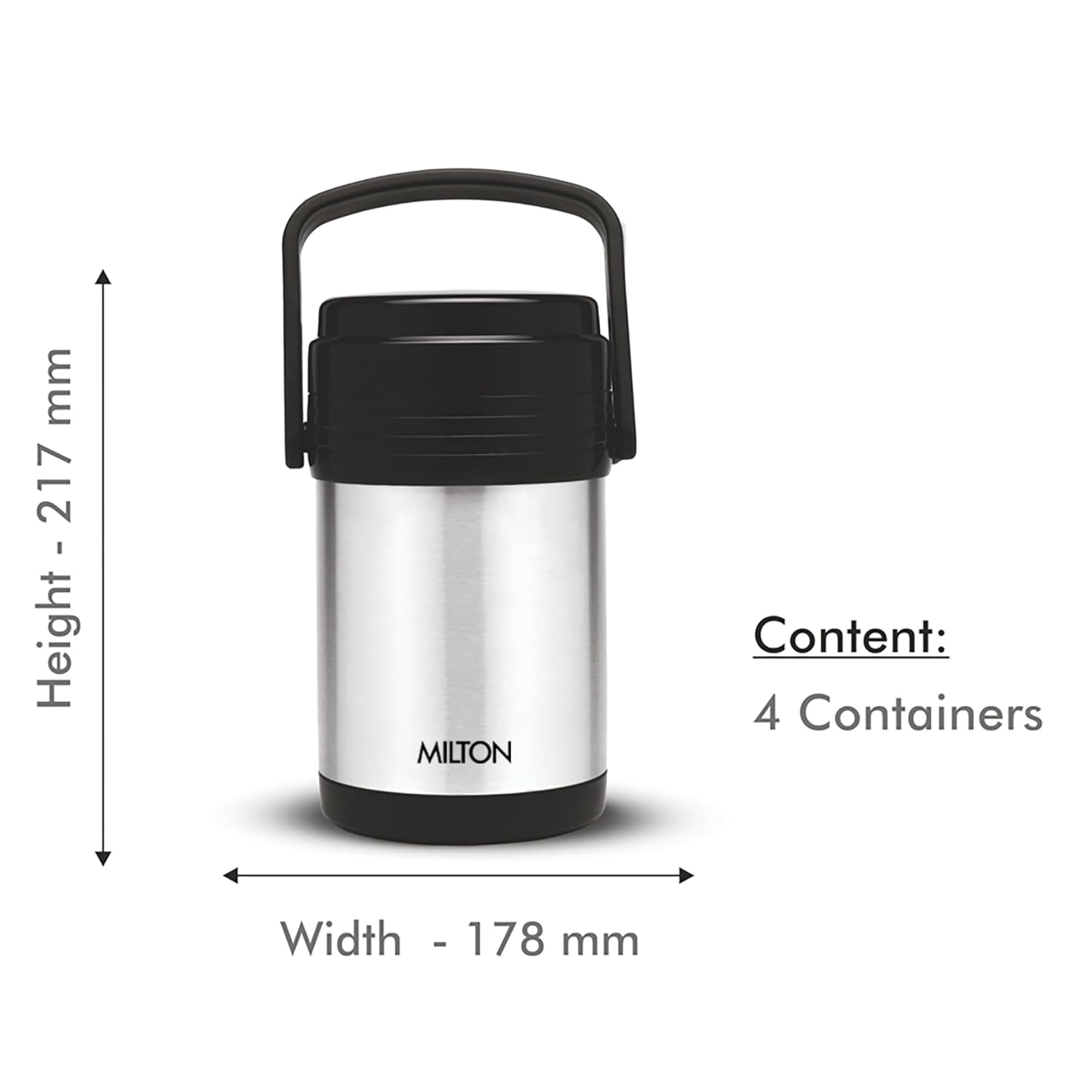- Materia type: Stainless Steel; No. of containers: 4; Capacity of containers: 4 Containers: 300ml Each; Contents include: Lunch Box Set With 4 Containers + 1 Carrier + 1 Bag; Colour: Black & Silver