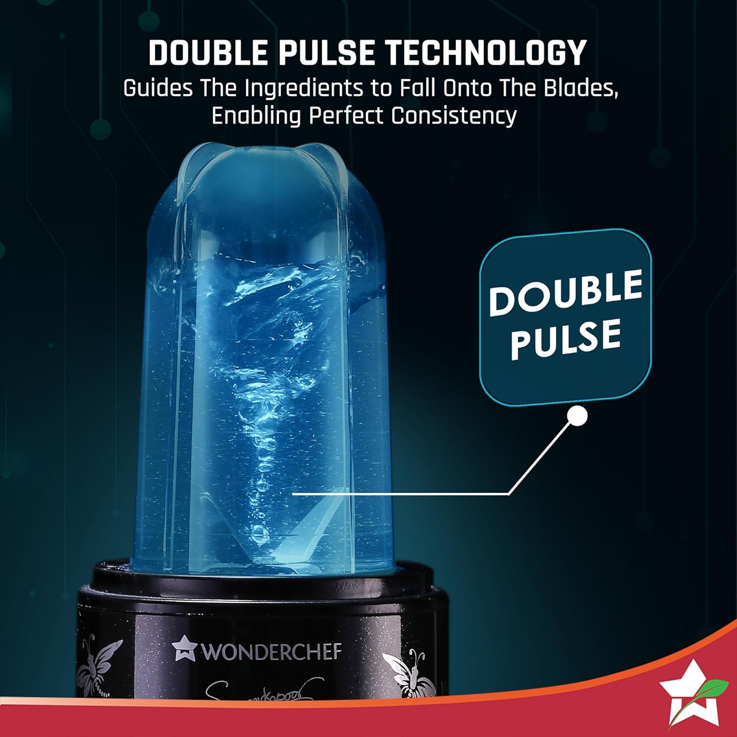 - DOUBLE PULSE TECHNOLOGY: Once the mixer starts, it stops twice for 2 seconds after every 4 seconds. This feature of very sophisticated blenders allows the contents to settle down and fall back on the blades for perfect blending rather than sticking on the sides.