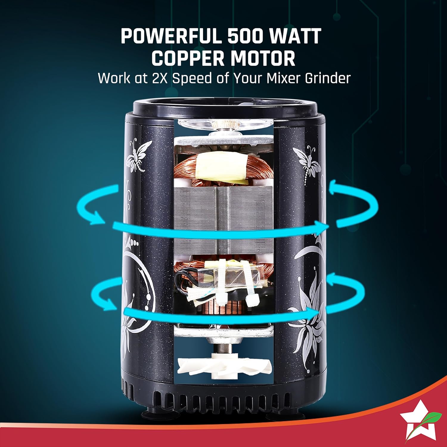 - POWERFUL 500W 100% FULL COPPER MOTOR: The best-in-class and powerful 500 Watt motor generates 22,000 RPM – twice that of normal mixer grinders. 100% Copper motor grinds the toughest chutneys and masalas with ease.
