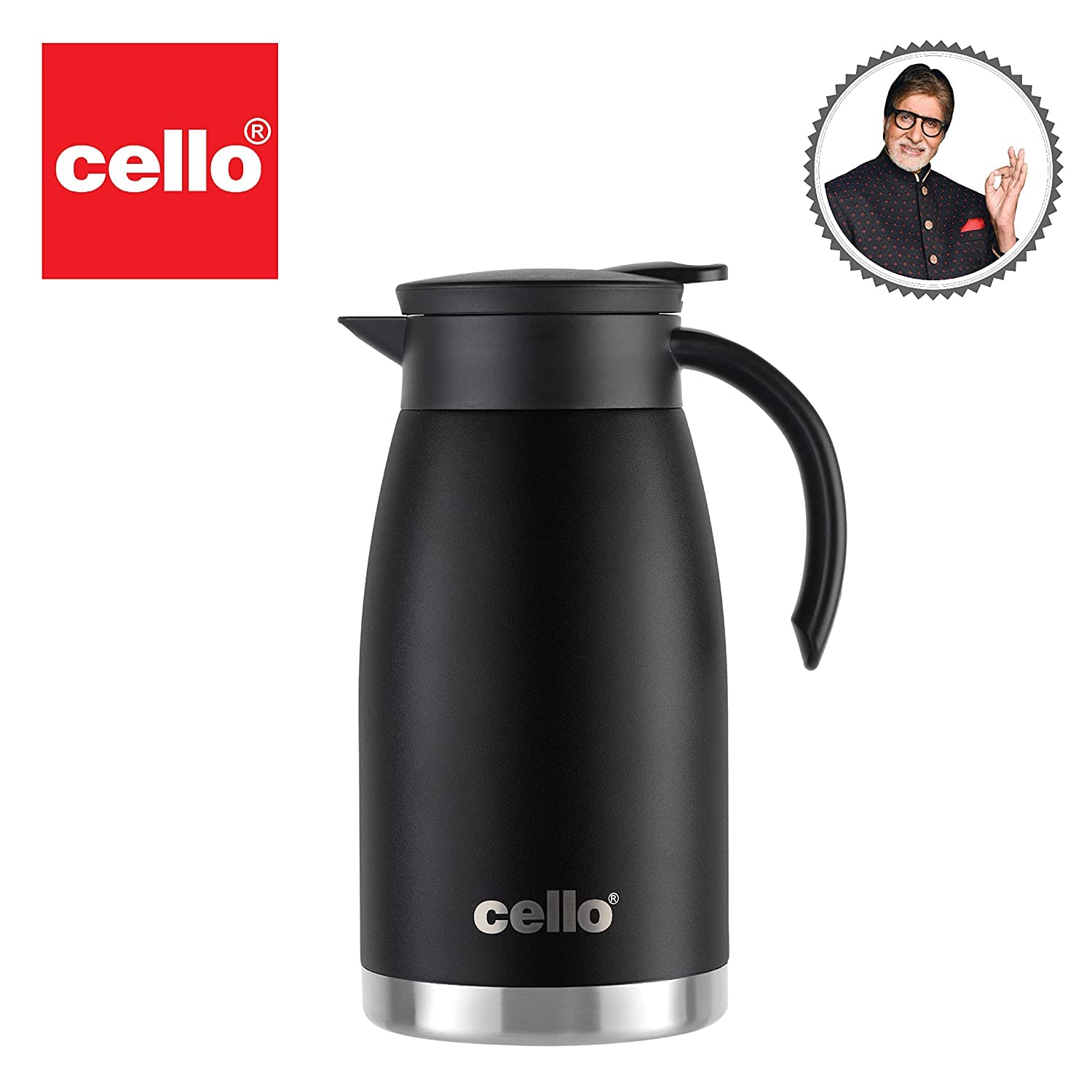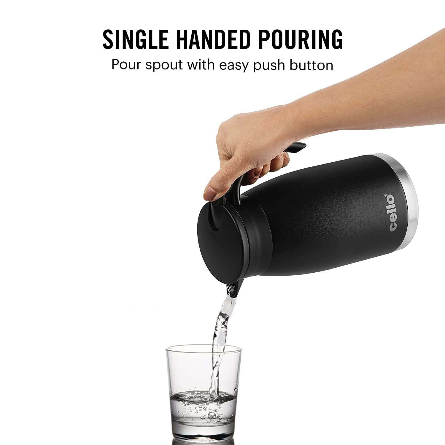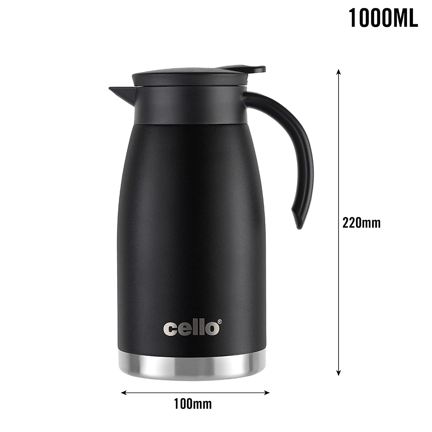 Cello Duro Pot | Hot and Cold Flask | Vacuum Insulated Teapot | Durable DTP Coating |Double Walled Carafe for Home and Office | 1100ml, Black