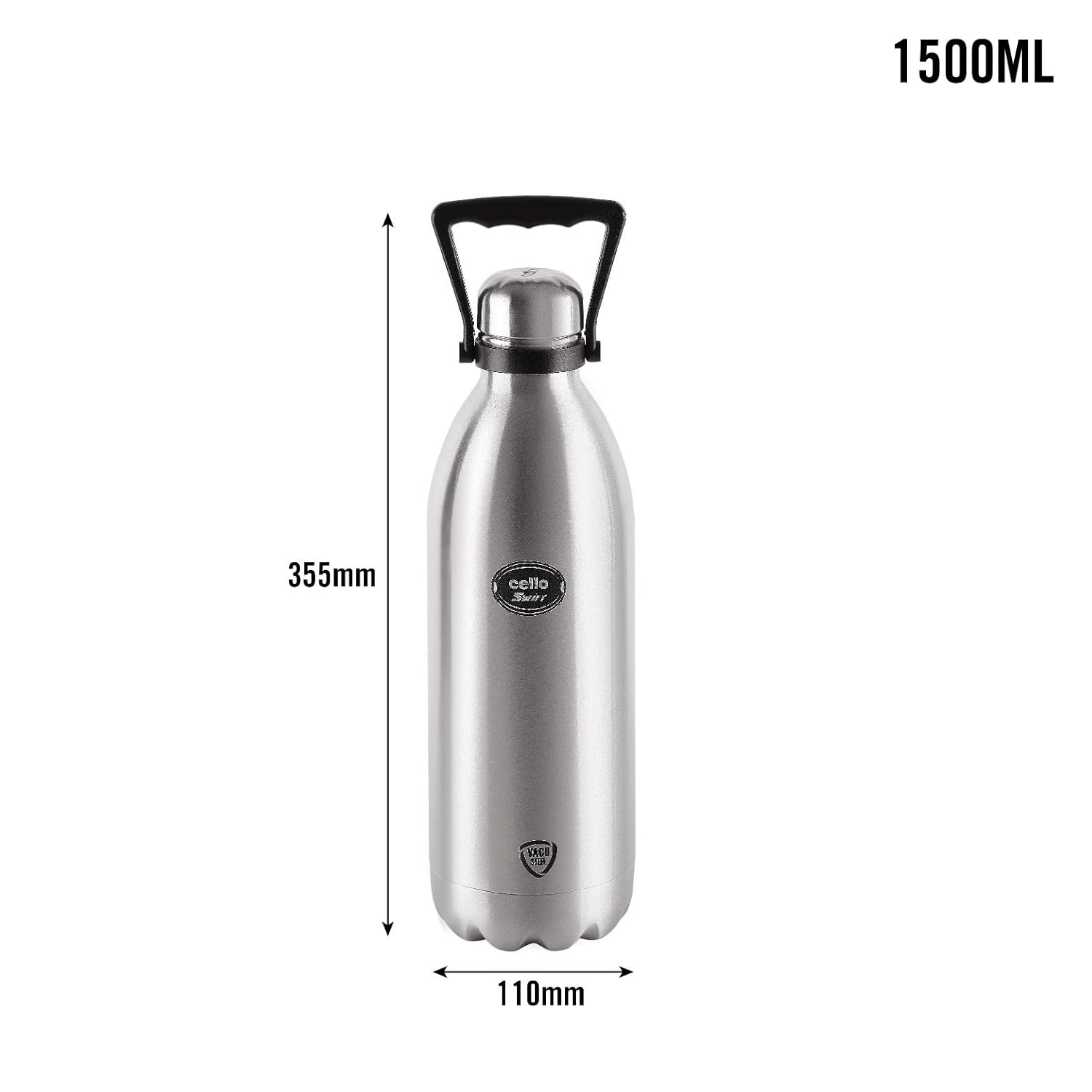 Cello Swift Thermosteel Water Bottle with Handle 1500ml, Silver | Double Walled Vacuum Insulated Flask Bottle | Keeps Drinks Hot or Cold for 24 Hours | Ideal for Water, Tea, Coffee & Cold Beverages