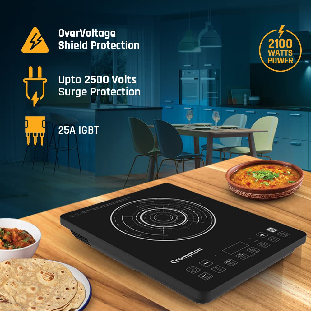 Crompton Instaserve 2100 W Induction Cooktop with 12 Feather Touch Buttons | 8 One touch Cook Menus |Slim Body | Overvoltage Shield Protection