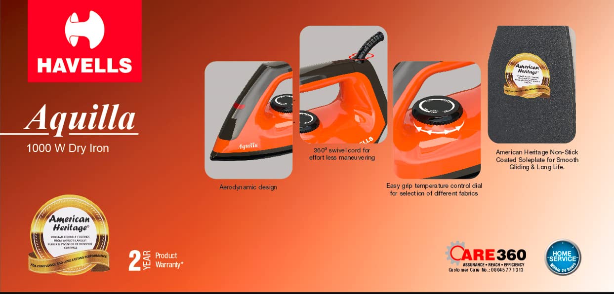Havells Dry Iron Aquilla 1000 watts | Iron Press German Technology | Plastic Non Sick Coated Sole Plate | Shock Proof Body | 2 Yr Manufacturer Warranty