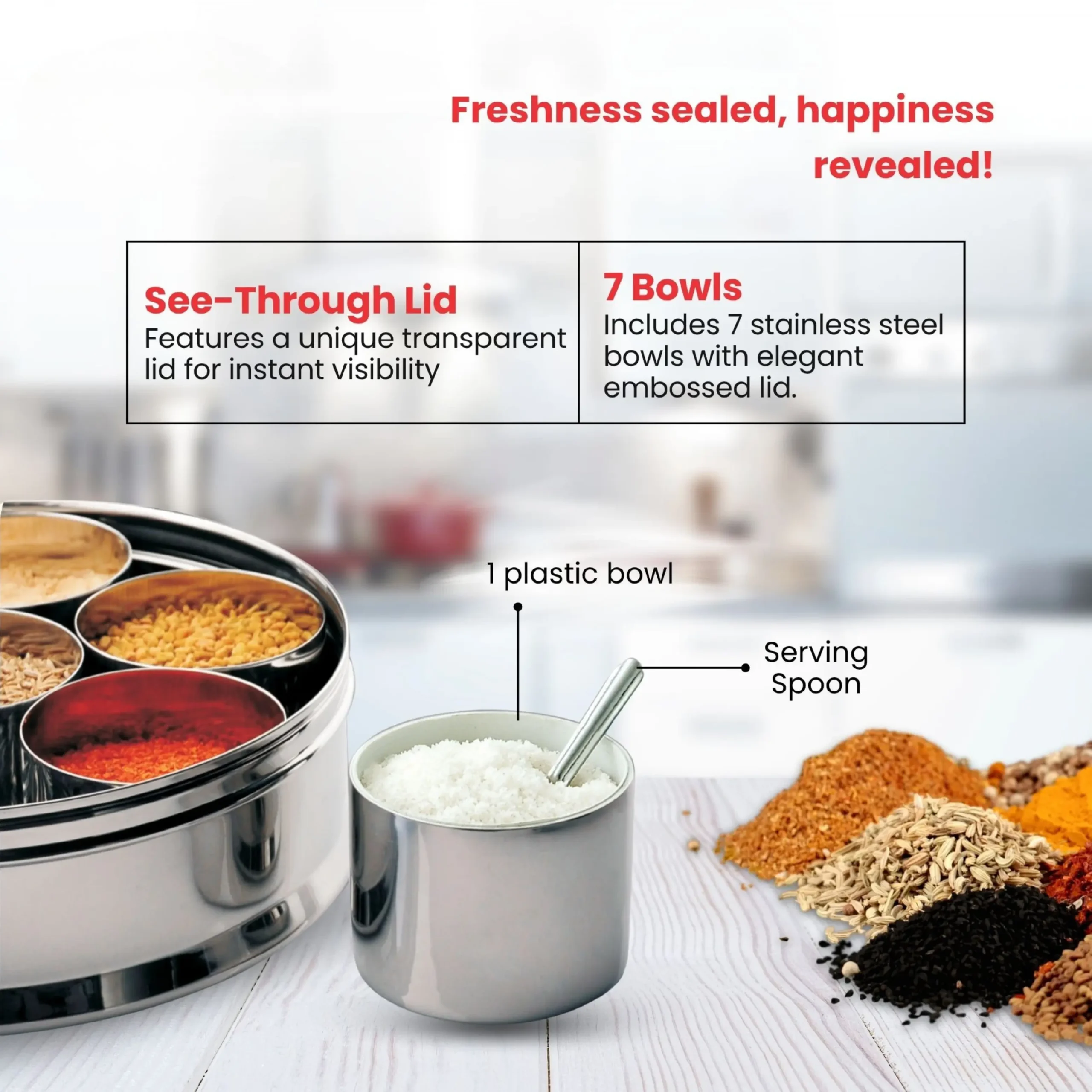 - Product Contains : 1 Spice Box which includes 7 small container,1 spoon and 1 Plain lid | Capacity : 150ml Each