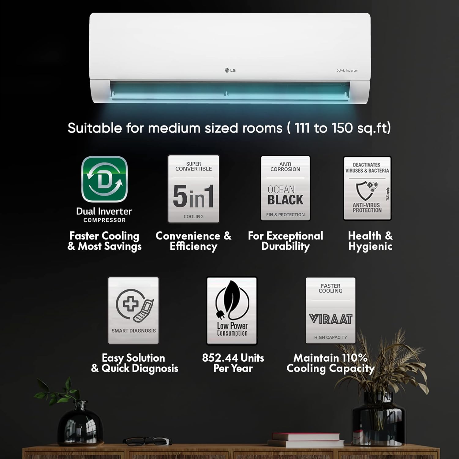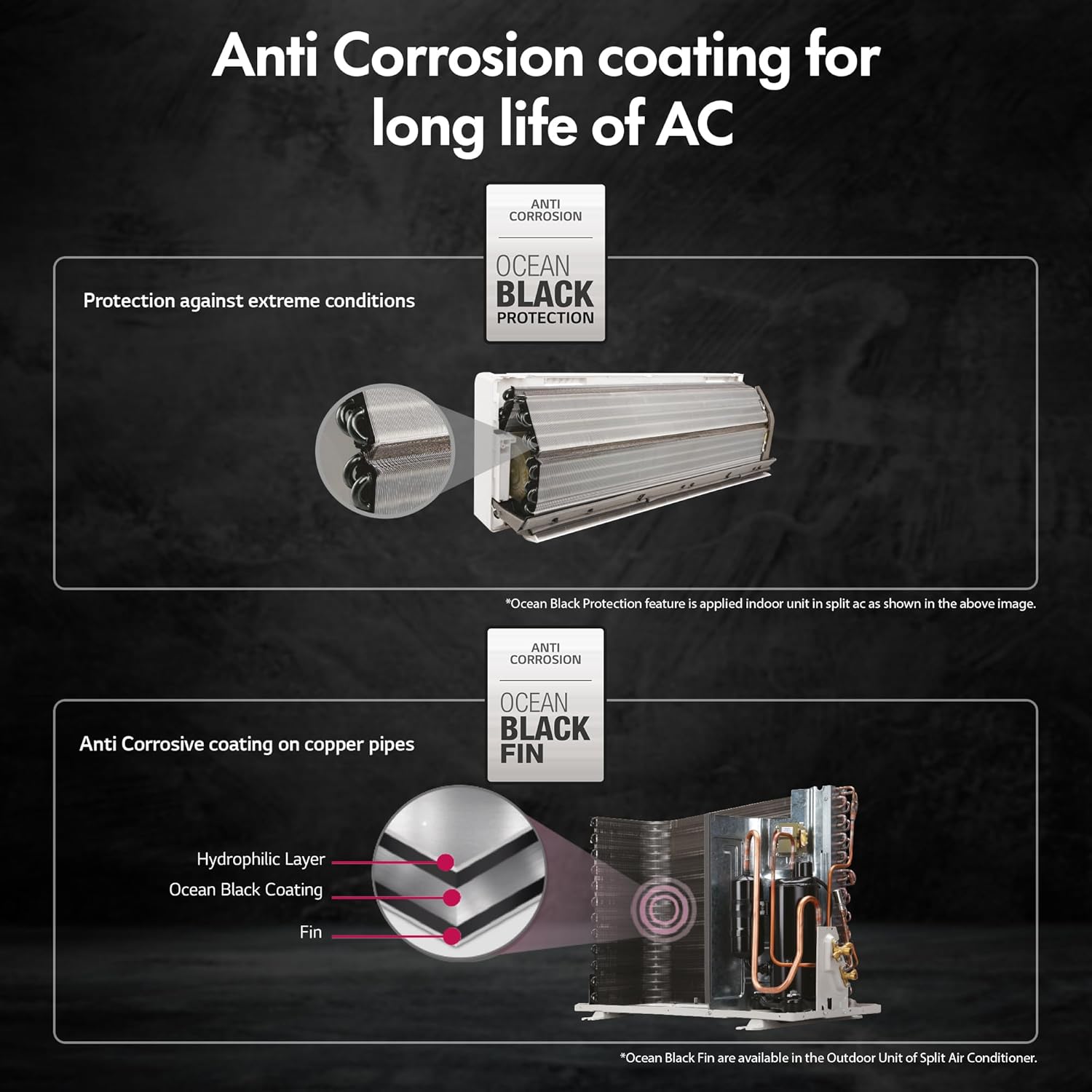 LG DUALCOOL ACs come with ocean black fin to offer unbeatable protection against dust, smoke and chemical presents in the environment.
