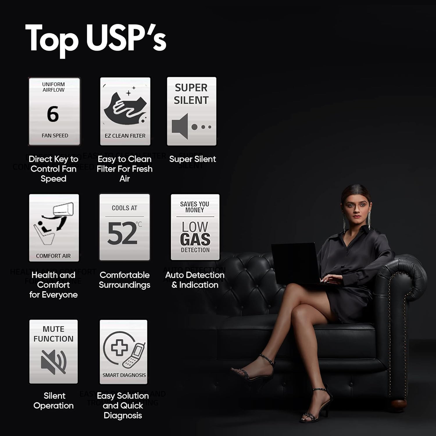 - Key Features: Stabilizer free operation within 120-290 Voltage range; Ocean Black Fin Anti Corrosive; Ez Clean Filter; Low gas detection; 100% Copper Condensor; 6 Fan Speed steps; Hi Grooved Copper; Smart Diagnosis System; Magic Display; Monsoon Comfort