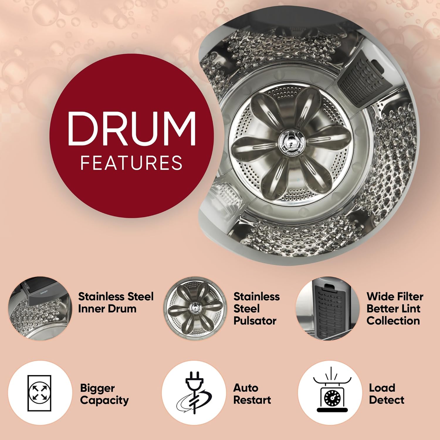 - Drum / Pulsator type & Body material: Stainless Steel Pulsator built to bring more durability- While the Stainless Steel Pulsator stays rust-free, it keeps you worry- free by providing hygienic clothes. Built tough, it comes with a long life too. | New wide filter design that increases the lint collection rate | Body material – Steel