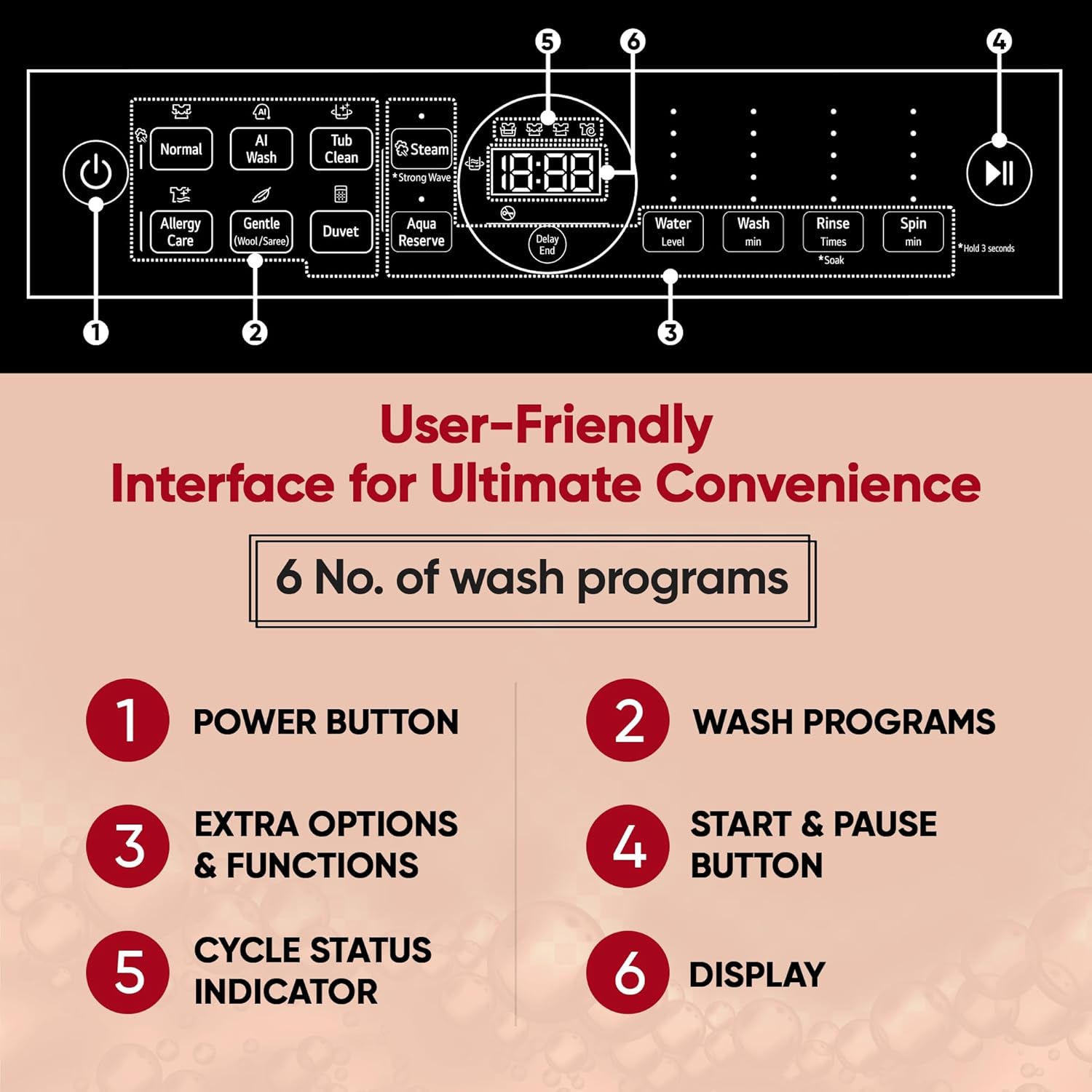 - Wash Programs: 06 No. of Programs – Normal: for everyday laundry items made of cotton, linen, and durable synthetics| AI Wash: dedicated separate cycle to enable customized washing using the best motion and stroke depending on the fabric | Quick Wash | Allergy Care | Gentle (Wool / Saree): for more fragile items, such as certain sweaters, athletic clothing, undergarments and lingerie, crocheted items | Tub Clean: keeping your wash drum clean| Panel information in detail – Power Button to turn on or off the appliance, Programme Button, Extra options and functions, Start / Pause Button, Cycle status indicator, Display: shows the settings, remaining estimate time, options, and status message