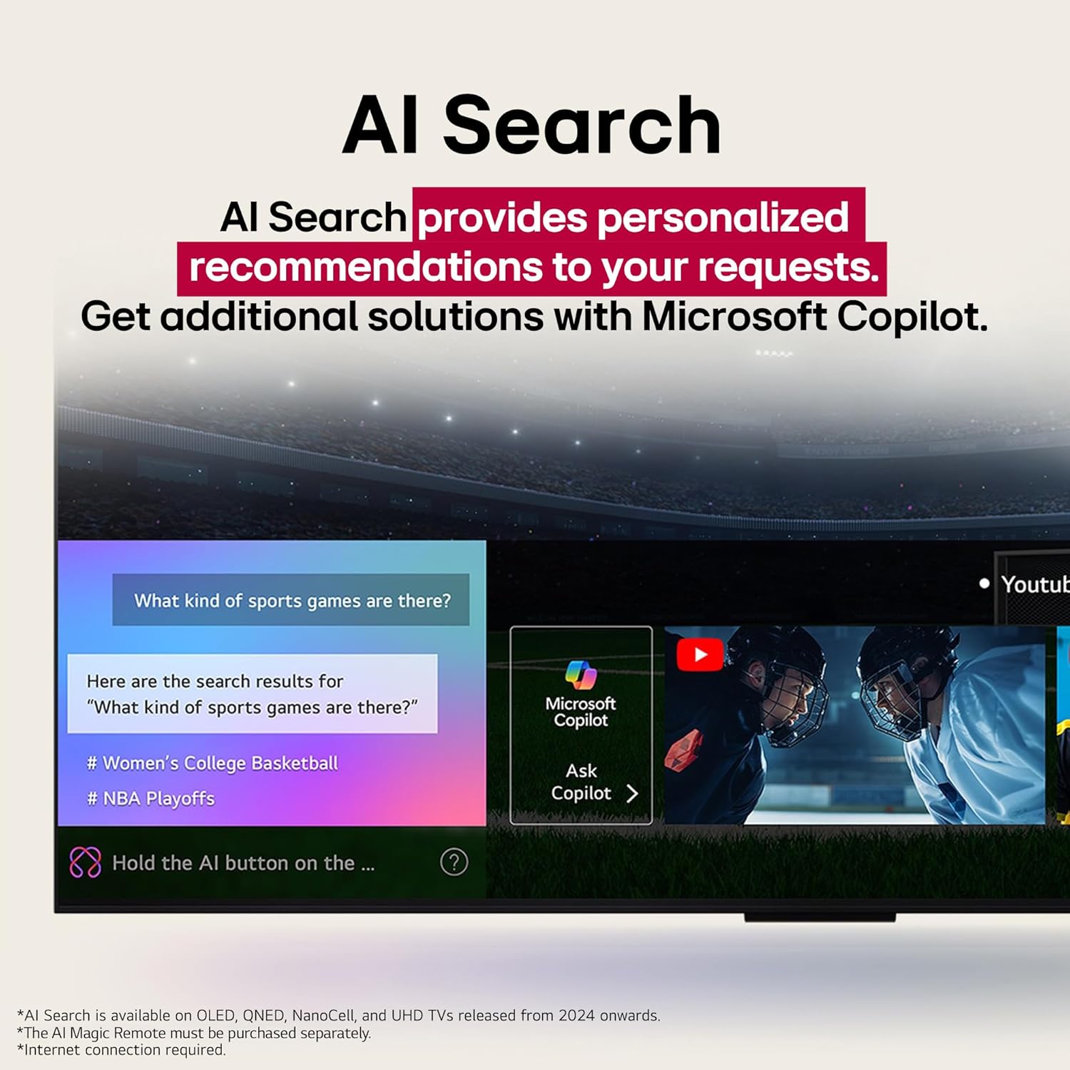 Ask your TV anything. Built-in AI recognizes your voice and swiftly provides personalized recommendations to your requests. You can also get additional results and solutions with Microsoft Copilot.