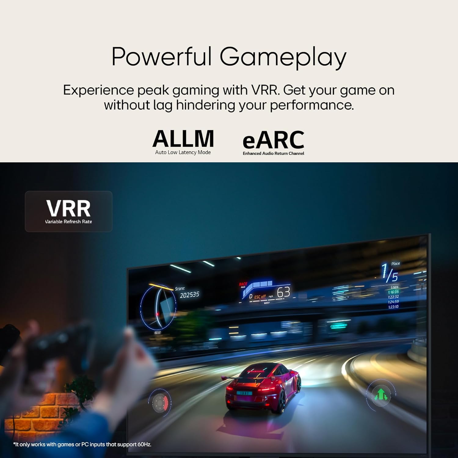 - Smart TV Features: ALLM (Auto Low Latency Mode) | WebOS 25 |Intelligent Voice Recognition (with LG ThinQ app) | AI Chatbot | Works with Hey Google | LG ThinQ /Hub | Google Home / Hub | Works with Apple Airplay| 2 GB RAM | 8 GB ROM | 100+ Free LG Channels | Supported Apps: Prime Video, Netflix, JioHotstar, Sony Liv, Zee5, Apple TV and more | Energy Rating: 1 Star | Annual Energy Consumption: 156.37* kWh/year