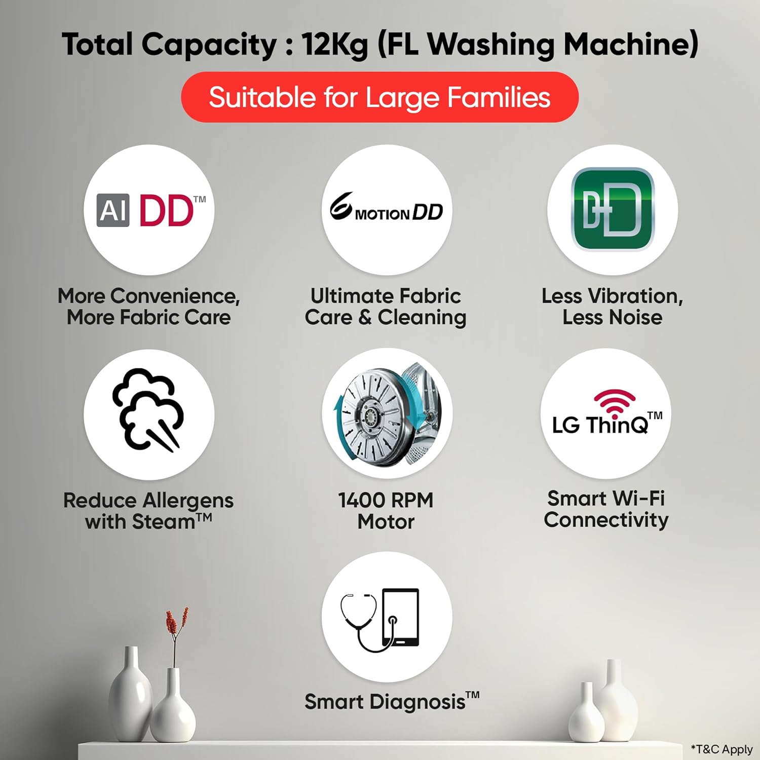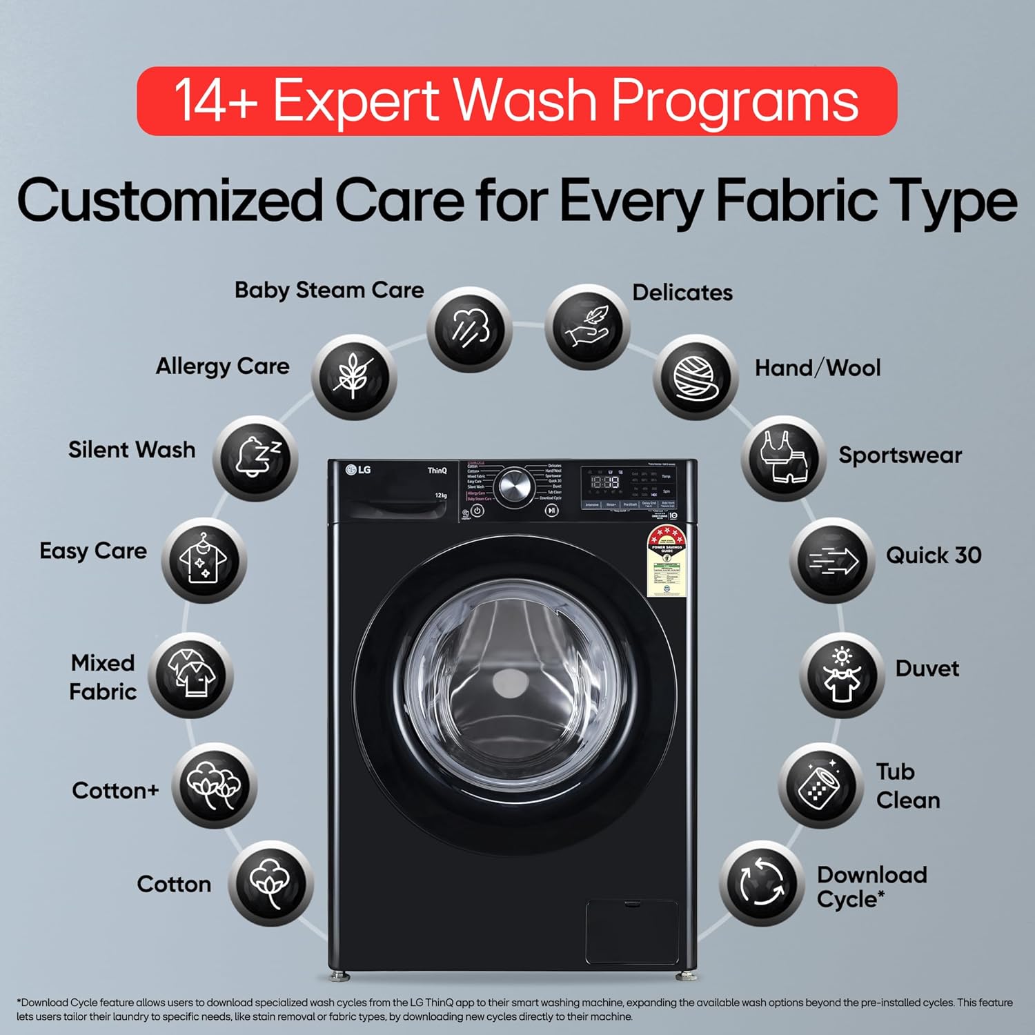 - Wash Programs: 14+ No. of Programs – Cotton; Cotton+; Mixed Fabric; Easy Care; Silent Wash; Allergy Care; Baby Steam Care; Delicate; Hand/Wool; Sports Wear; Quick 30; Duvet; Tub Clean; Download Cycle: can download additional wash programs using LG ThinQ app | Display Type – Dial + Full Touch Buttons & LED Display; Water proof Panel
