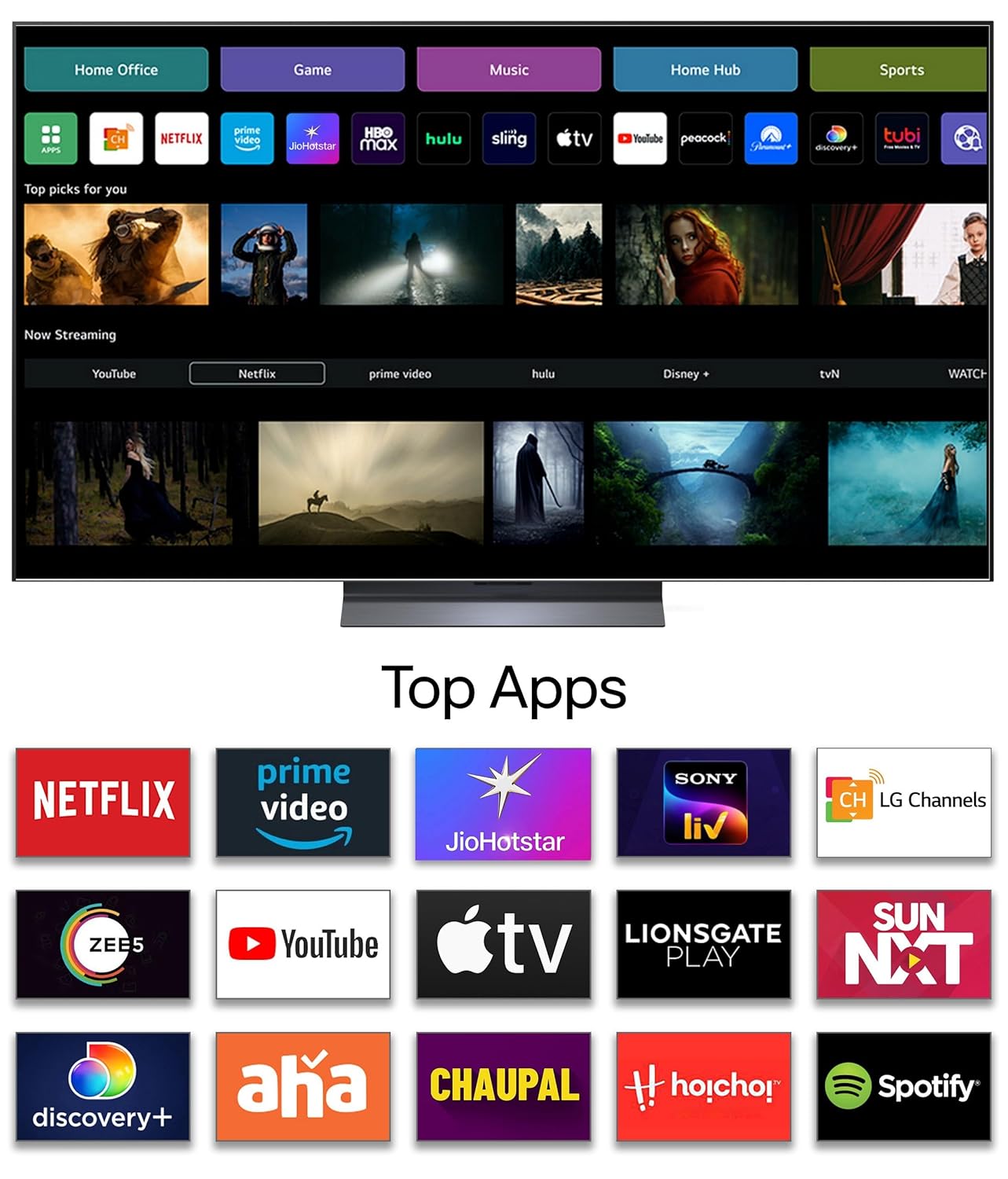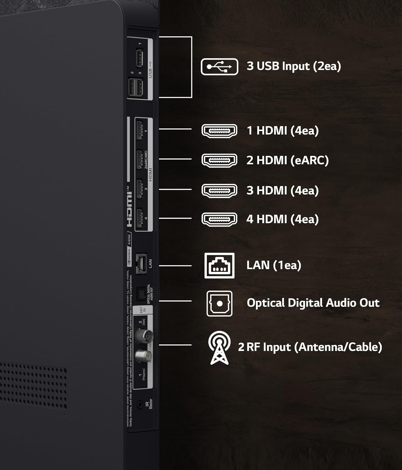 - Connectivitiy: 4 HDMI ports (supports 4K 120Hz, eARC, VRR, ALLM, QMS) | Simplink (HDMI CEC) | HDMI Audio Return Channel (HDMI 2) | 3 USB Input (v 2.0) | Wi-Fi (6) | Bluetooth Support (v 5.3) | 1 Ethernet Input (LAN) | 2 RF Input (Antenna/Cable) | 1 SPDIF (Optical Digital Audio Out) | IR Blaster