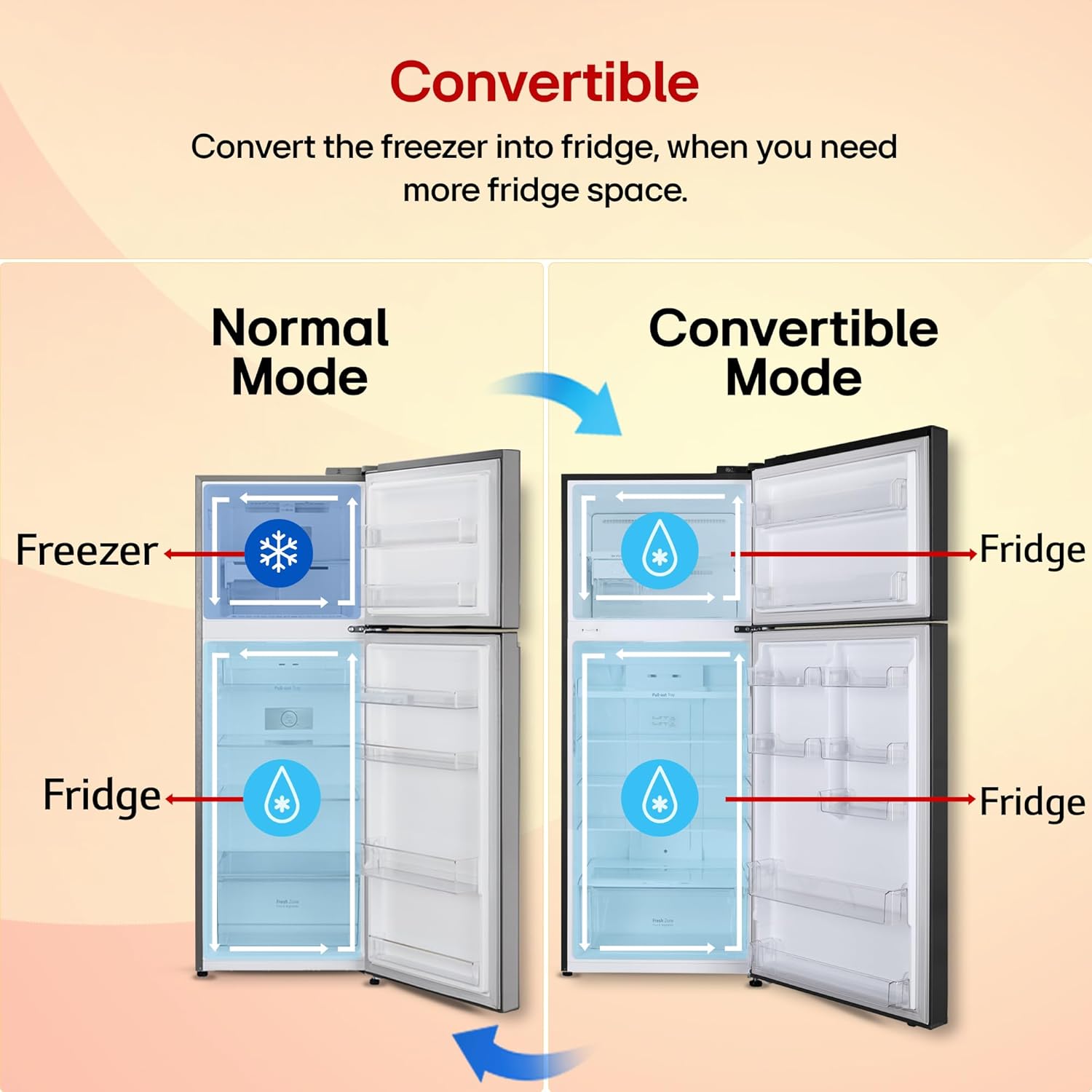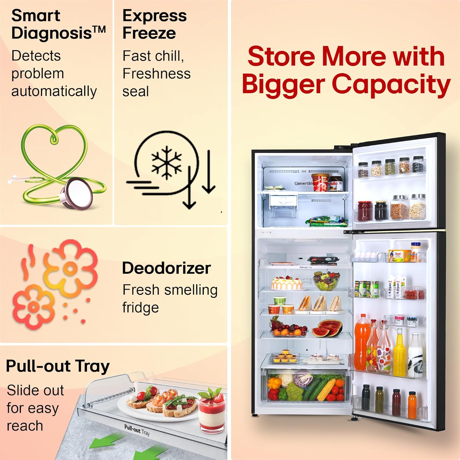 - Key Features: Convertible – Freezer to fridge conversion, offers you more space to suit your needs; Door Cooling+ – 35% faster cooling; Temperature Control – I Micom Tact; Express Freeze – for preserving food quality and nutrients, and it also helps achieve desired freezing temperatures; Smart Diagnosis – Detects problems automatically; Deodorizer – free from unpleasant smells; Anti-Bacteria Gasket for hygiene and food freshness; Humidity Controller – maintains moisture and temperature levels to keep fruits and vegetables fresh and nutritious; Works Without Stabilizer (100 ~ 310V)