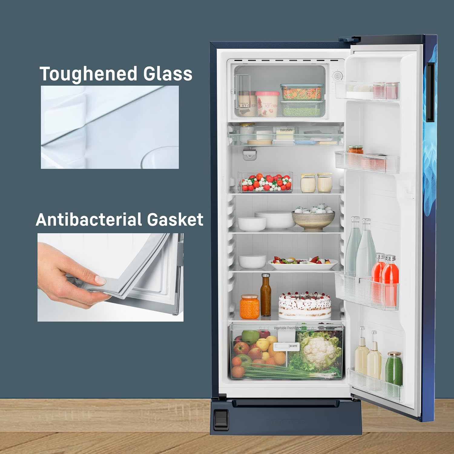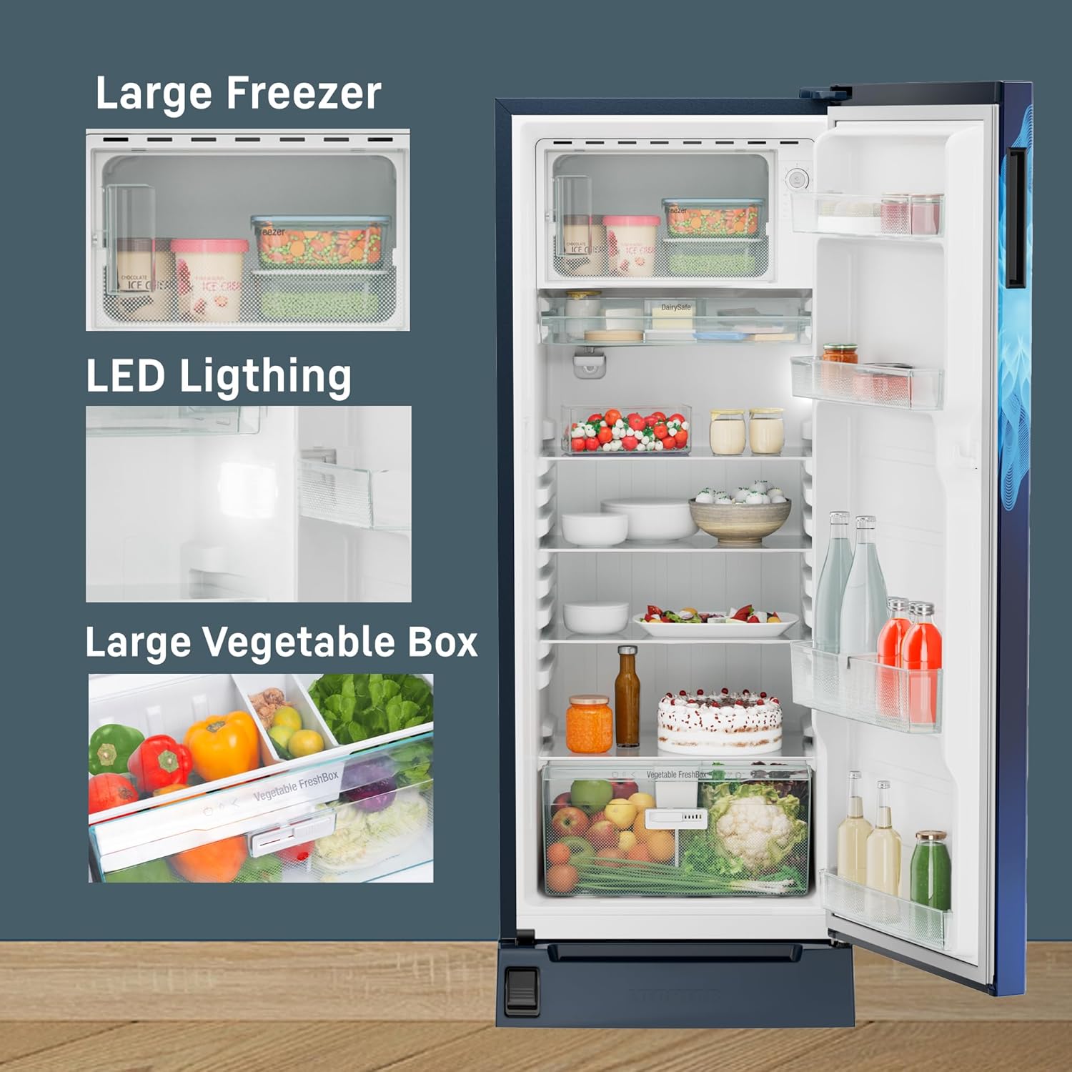 - Additional Features : Easy Clean Back | VegtableFresh Box | 2.25L Big Bottle Storage | LED Light | 22l Big size Freezer | Premium Door Finish | DairySafe | Adjustable Feet