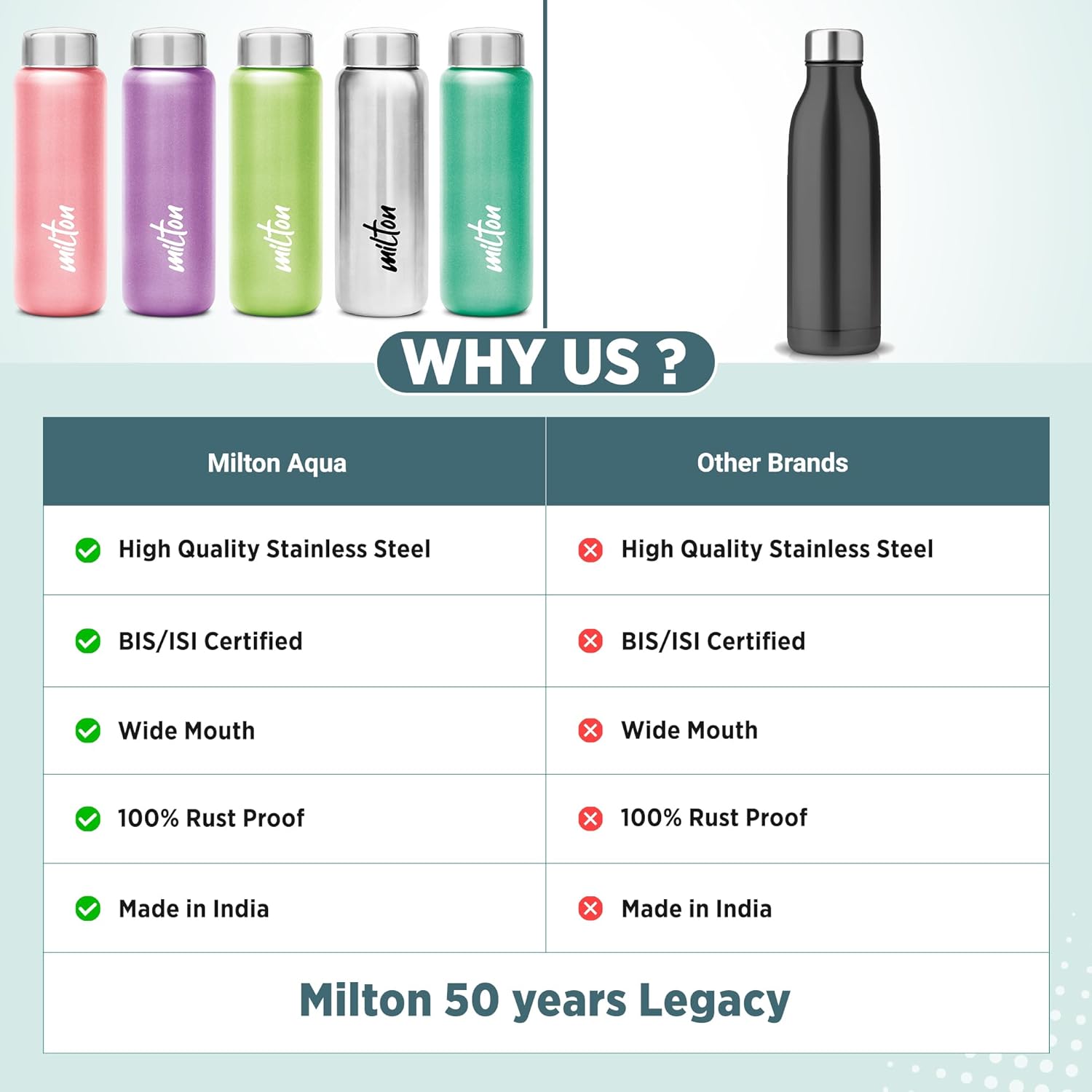 MILTON Aqua 750 Stainless Steel Water Bottle 750ml, Single Walled, ISI Certified I Leak Proof Lid, Rust Proof I For School, Office, Gym