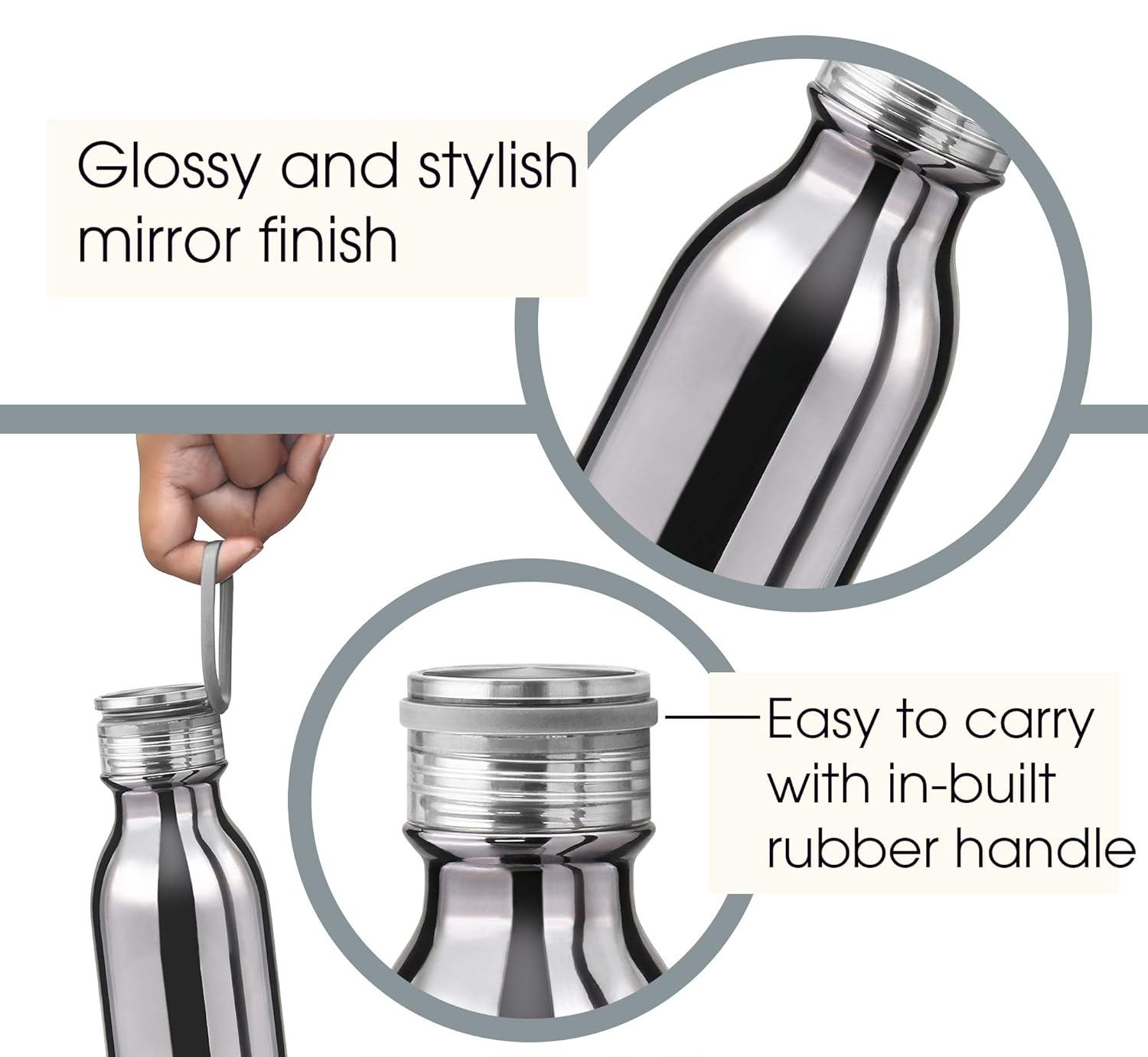 - Double walled insulated water bottle is made up of a durable 18/8 stainless steel, built to withstand the demands of everyday use. Stylish glossy mirror finish bottle with built-in rubber handle for easy grip and portability