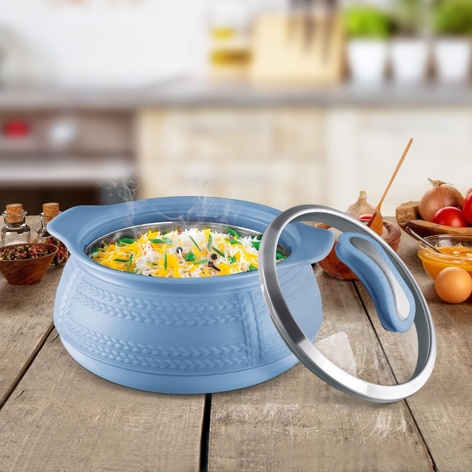 - Double walled Inner stainless steel casserole keeps food hot and fresh for hours. Its sleek and attractive design (vacuum metallized / wooden prints) make it a must have to enhance your dining décor.