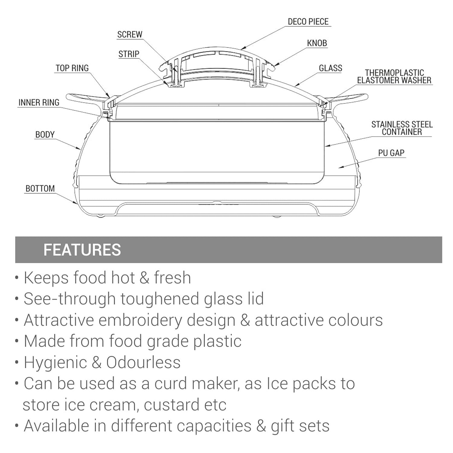 - Enhance the look of your dining table with its exclusive shape and design. It can be used for Salads, chapatti, Roti and it can also be used as a curd maker, as Ice-packs to store ice-cream, custard.