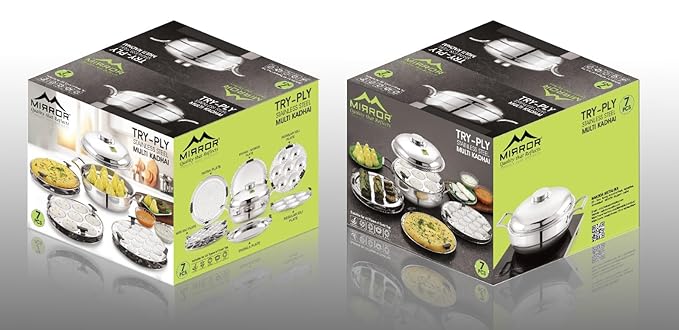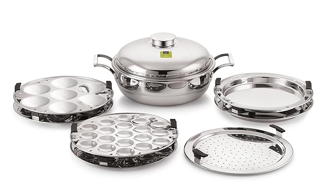 • This stainless steel tri-ply multi kadhai set includes 7 plates – 2 idli plates, 2 dhokla plates, 2 mini idli plates, and 1 patra/modak/momo plate.