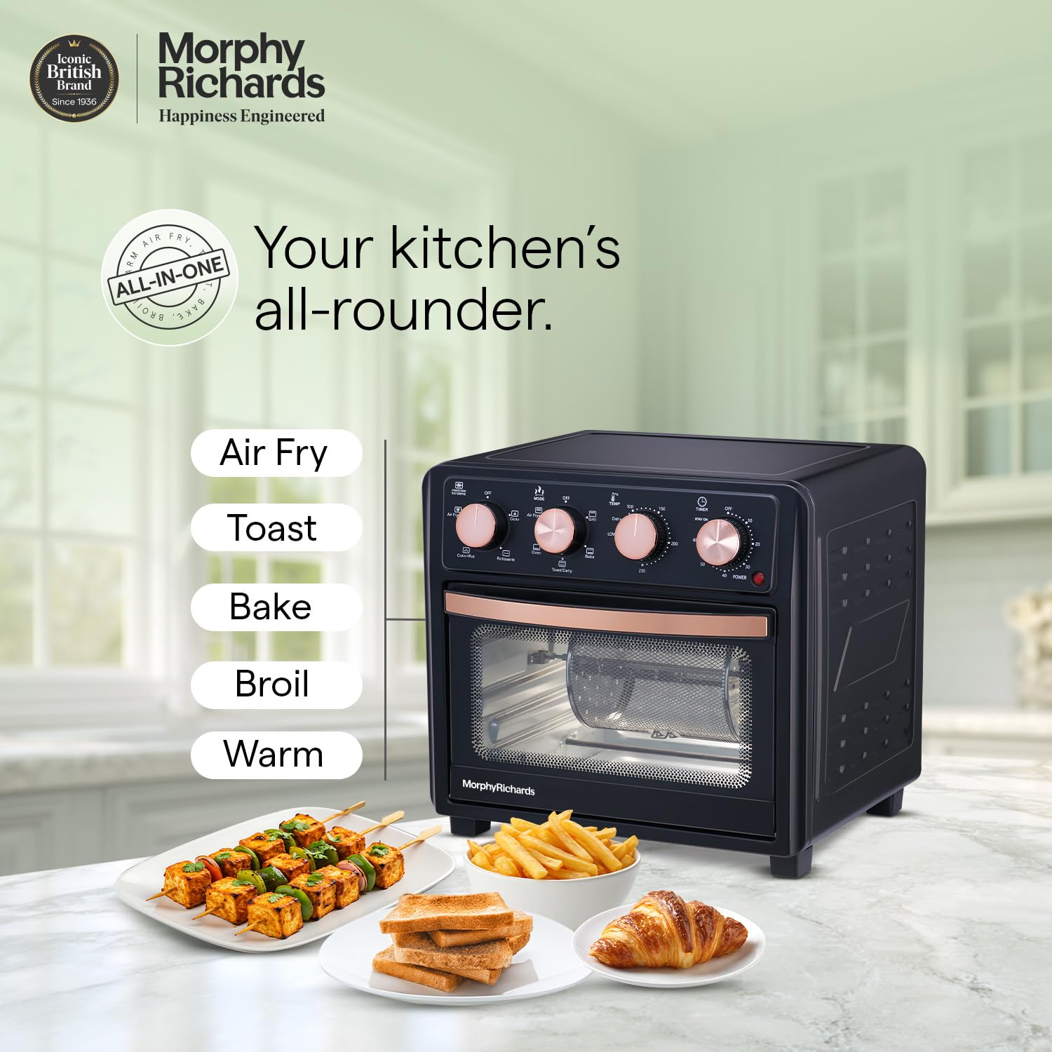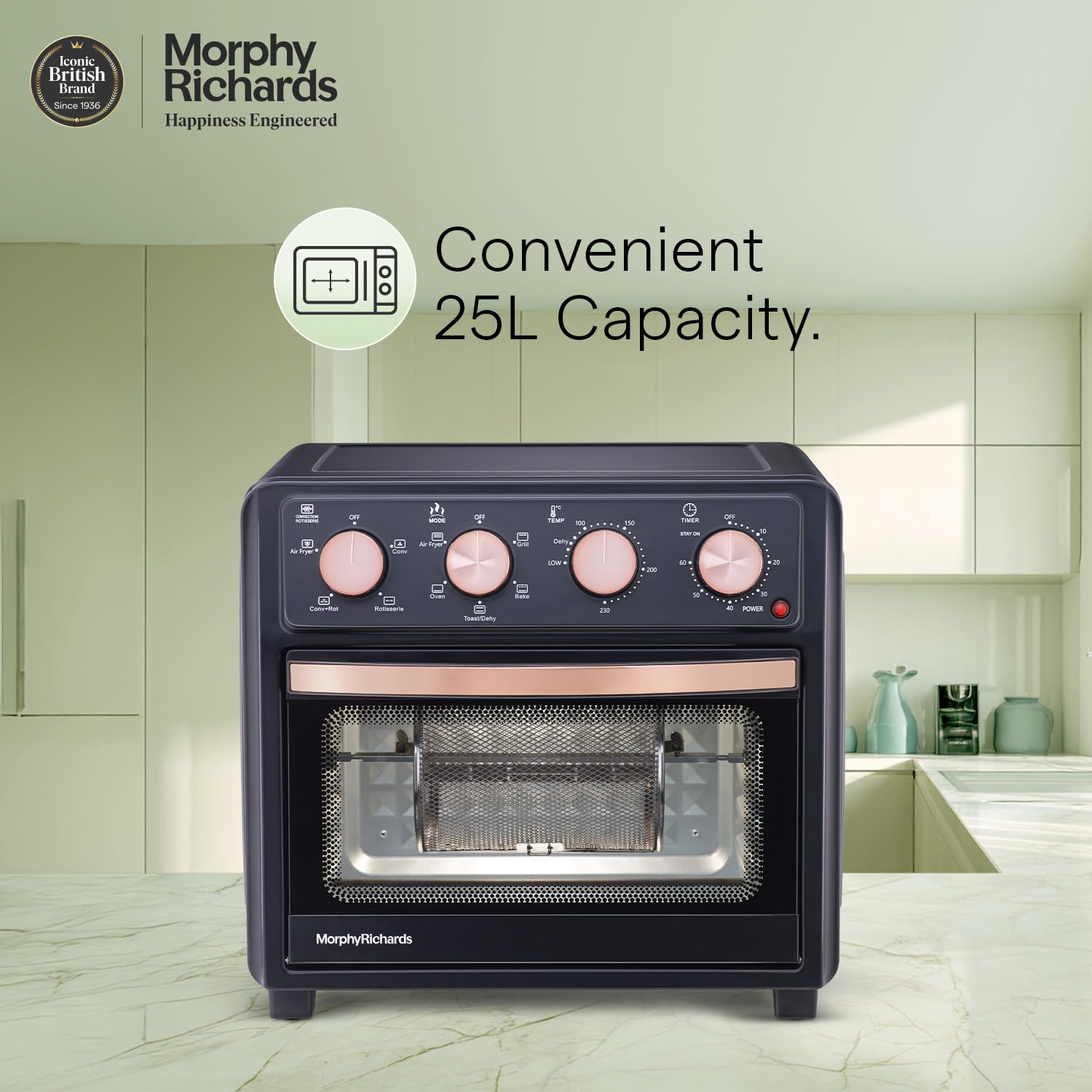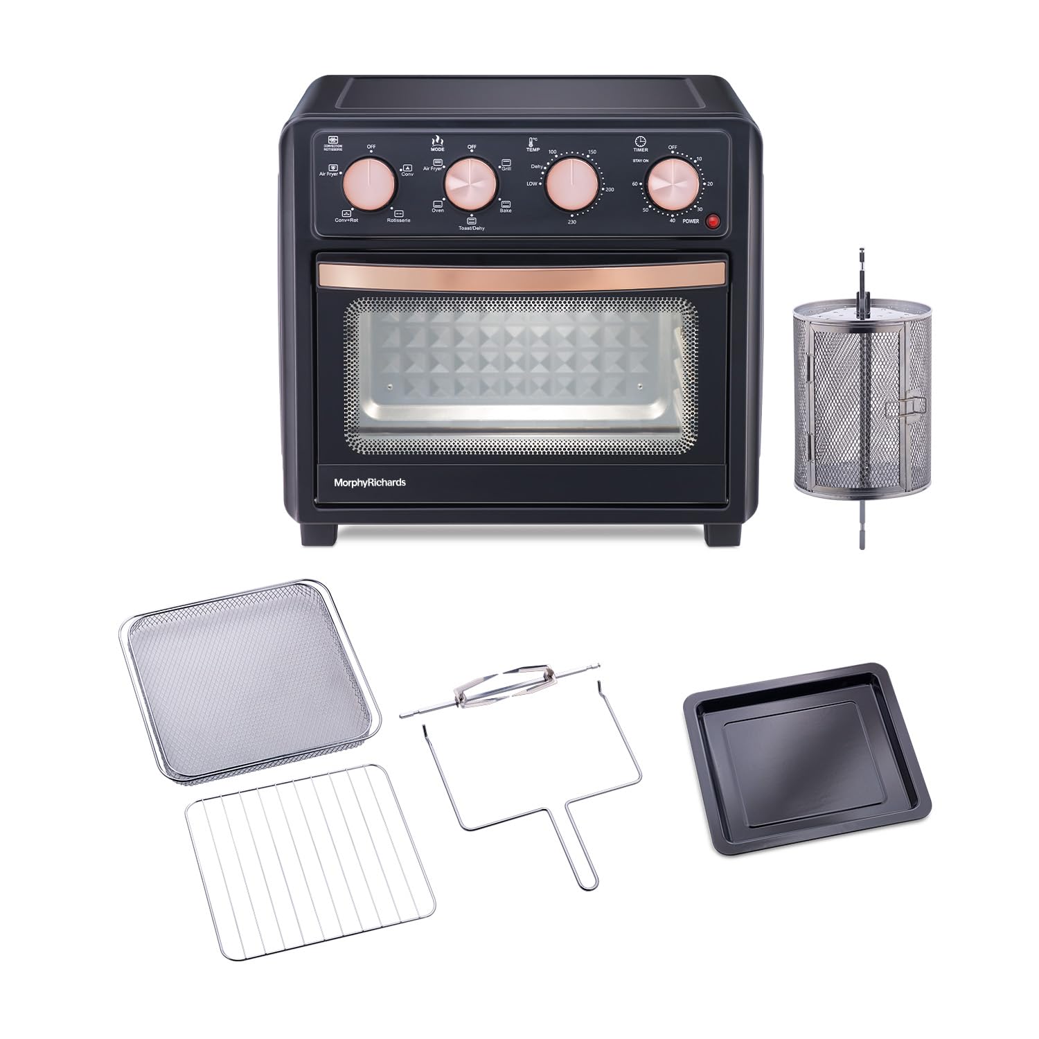 - Morphy Richards AirCrisp is 25 Litre Large capacity Air Fryer Oven with premium Black & Rose gold finish – to fit in modern kitchen. It has All in One feature – Air Fry, Dehydrate, Bake, Toast, Broil & Warm
