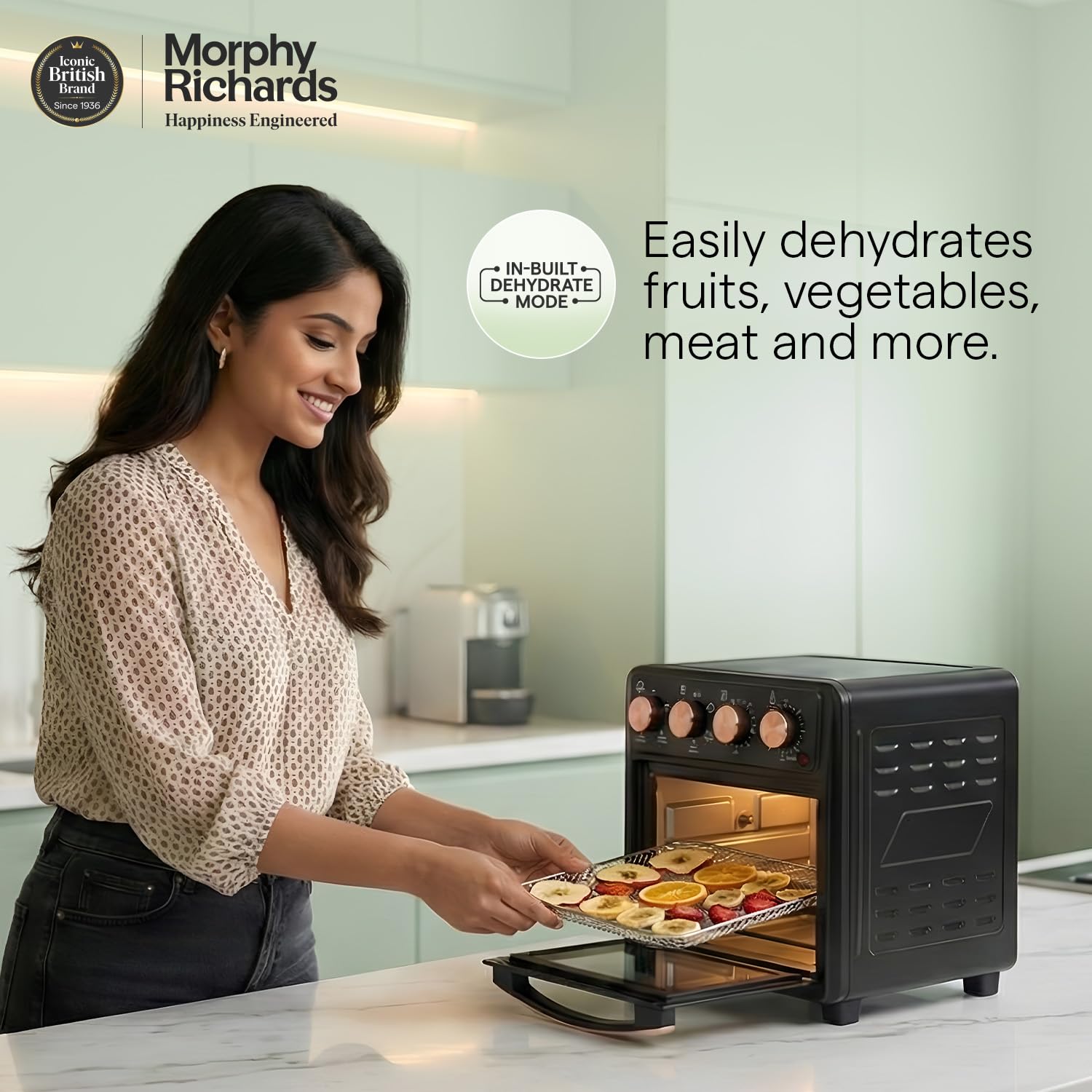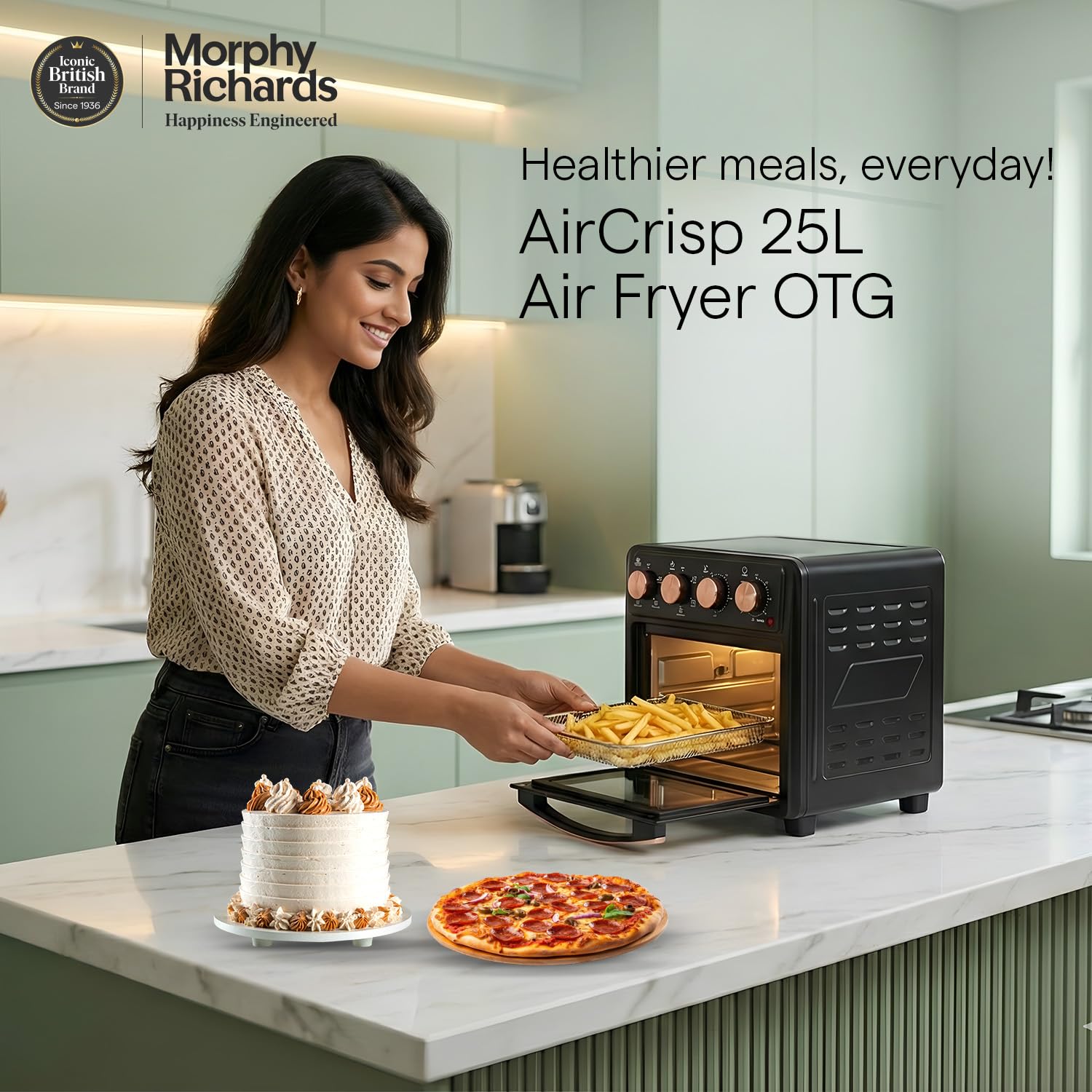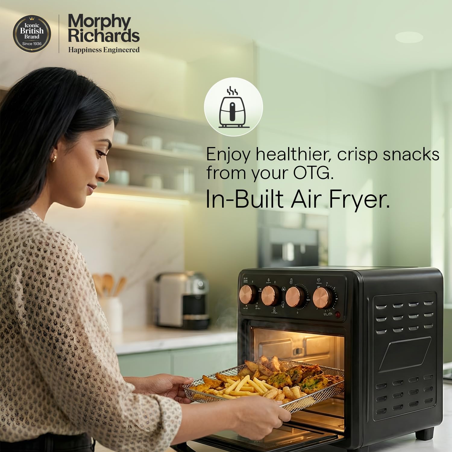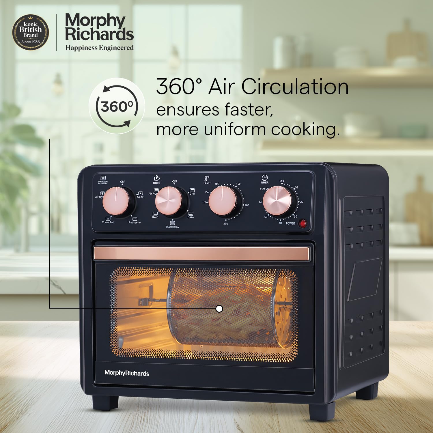 - Morphy Richards AirCrisp is 25 Litre Large capacity Air Fryer Oven with premium Black & Rose gold finish – to fit in modern kitchen. It has All in One feature – Air Fry, Dehydrate, Bake, Toast, Broil & Warm