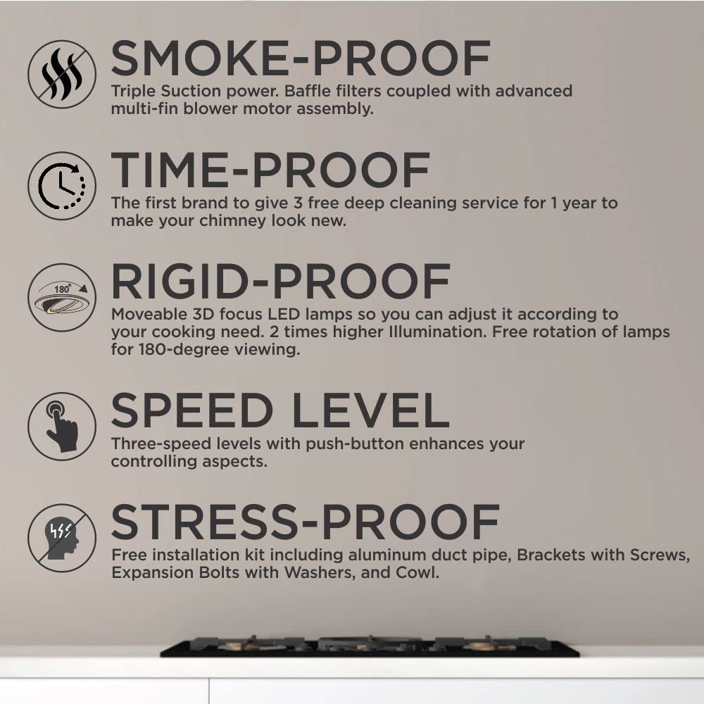 - Time Proof : The first brand to give 3 free deep cleaning service for 1 year to make your chimney look new.
