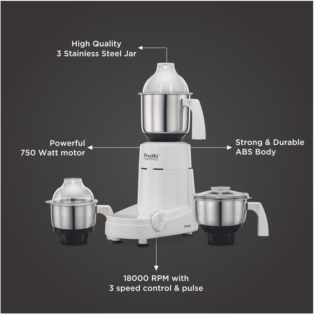 Preethi Chef Pro Mixer Grinder for Kitchen |L-shaped 750 watt Mixie, 3 jars| 2 Yr product warranty, Lifelong Free service | White