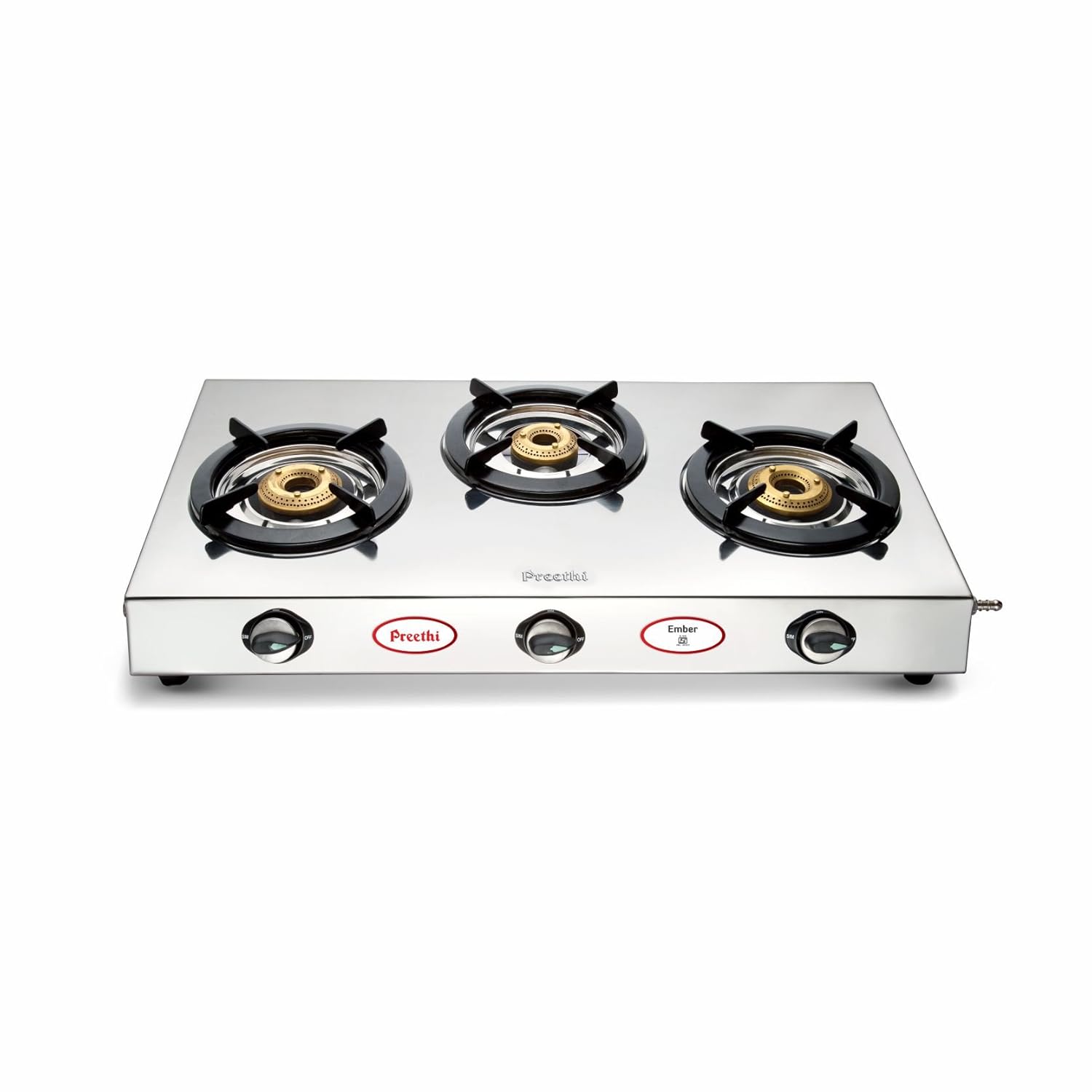 Preethi Ember Stainless Steel 3-Burner Gas Stove | Jointless Body | Bigger Body Size| Removable Drip Tray | Heavy Brass Burner|Gas Lighter Holder,Manual