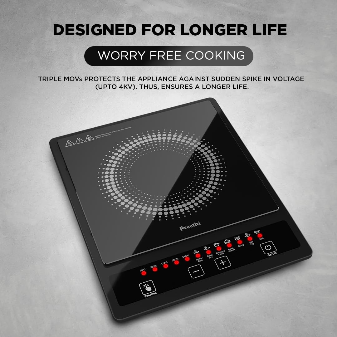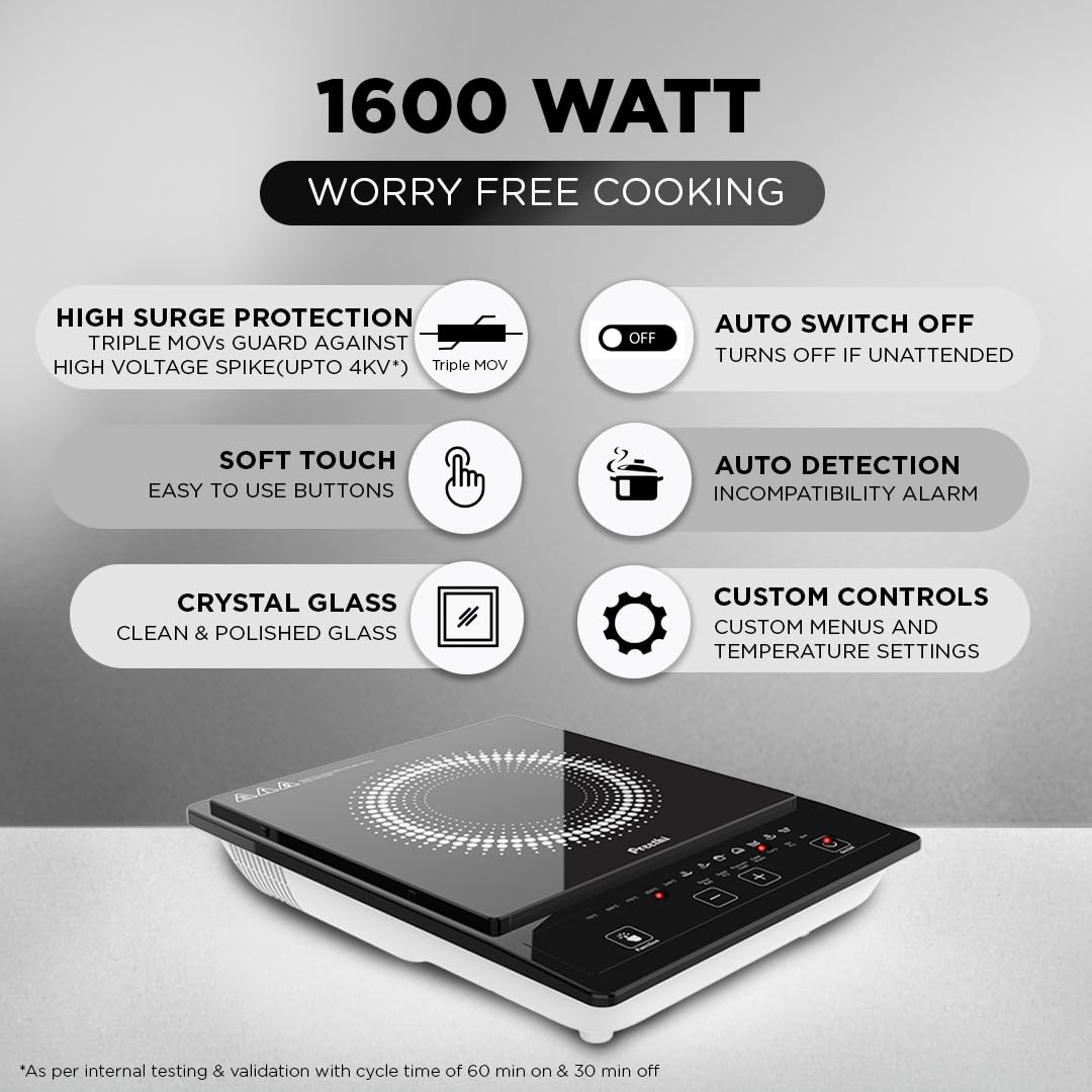 Preethi Indicook IC123 Induction Cooktop, 1600-Watt Electric Stove with Soft Touch Buttons and Crystal Glass (Black)