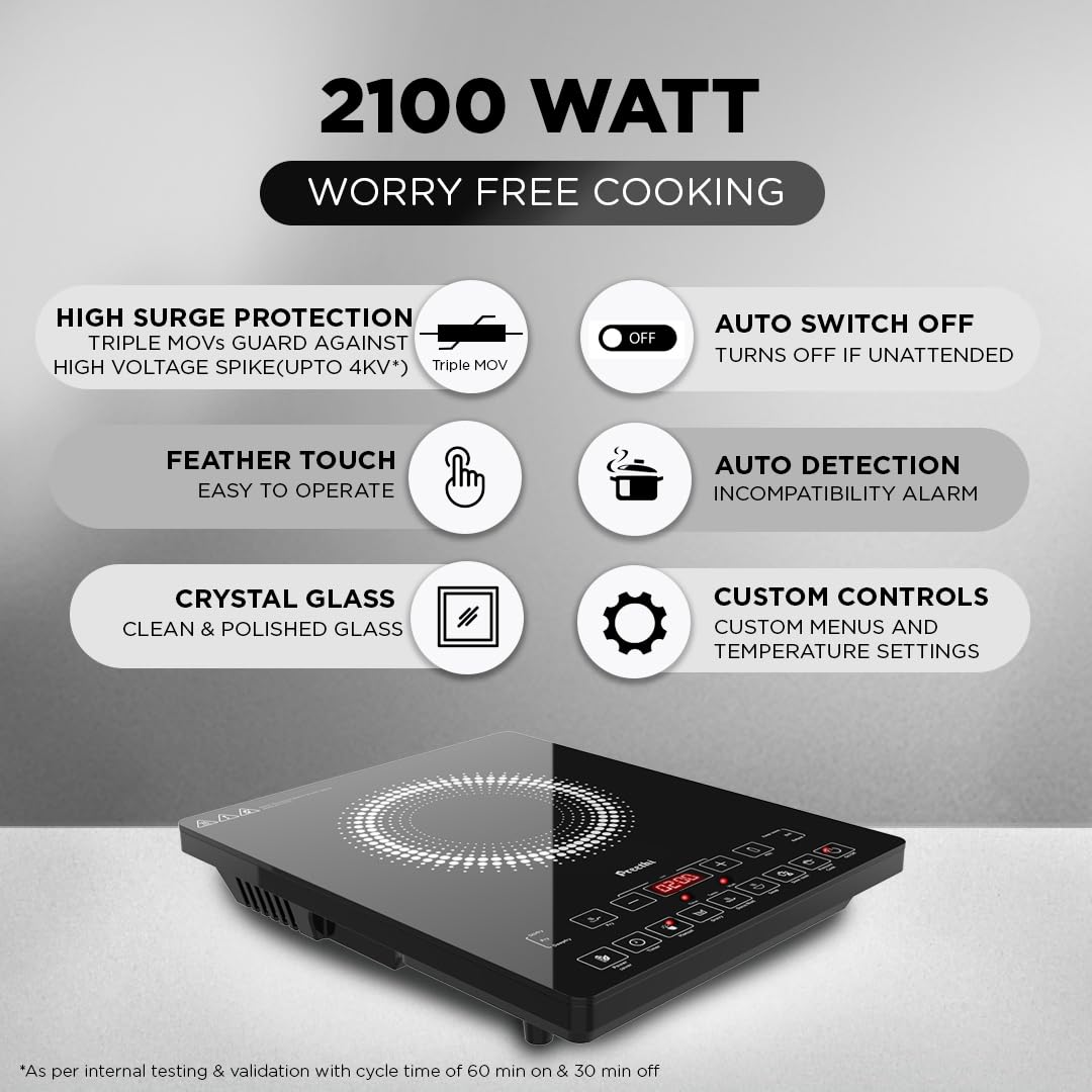Preethi Indicook IC125 Induction Cooktop, 2100-Watt Electric Stove with Feather Touch Operation and Crystal Glass (Black)
