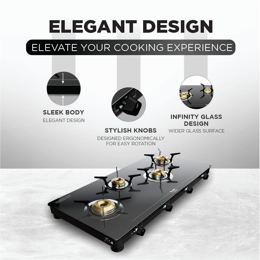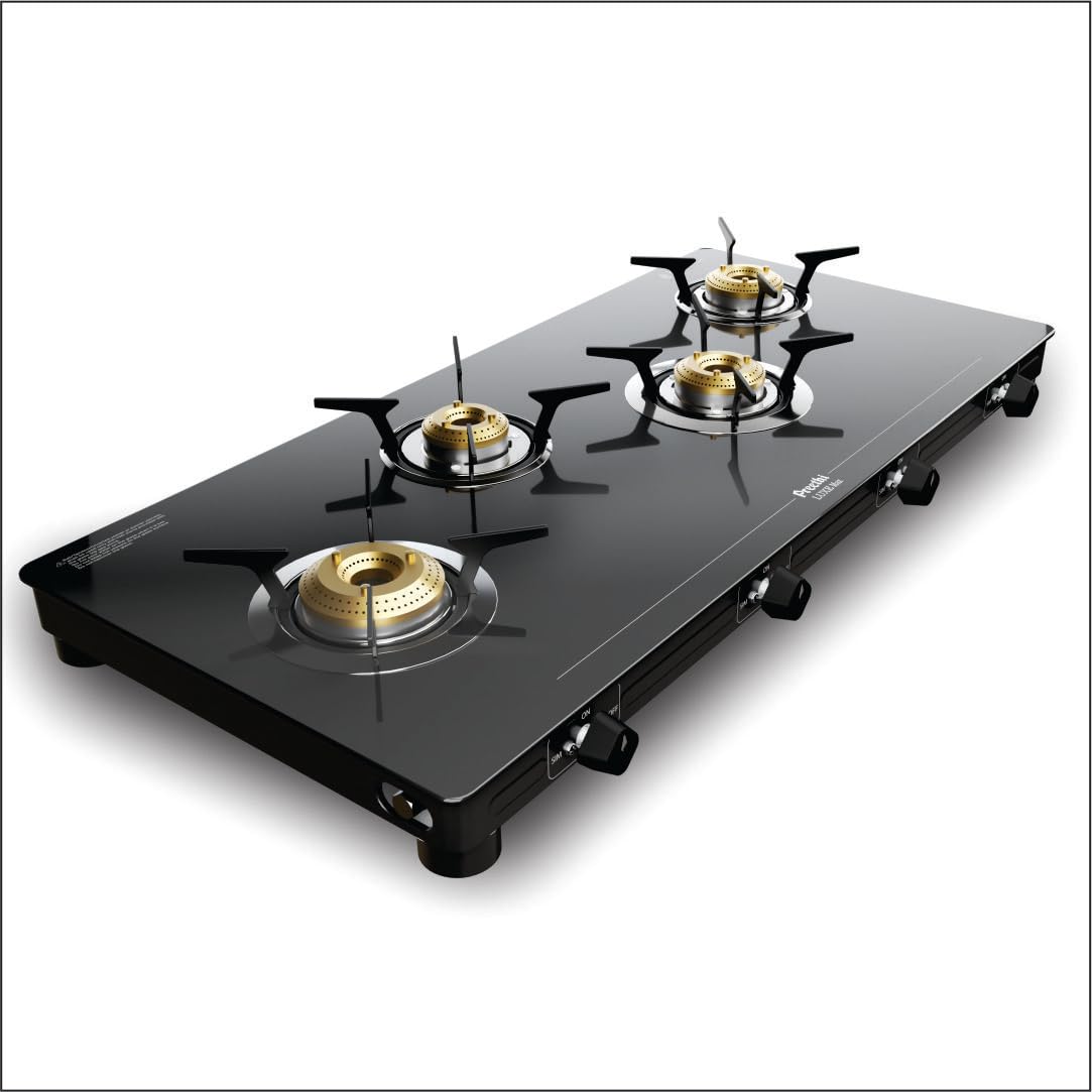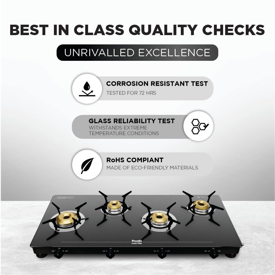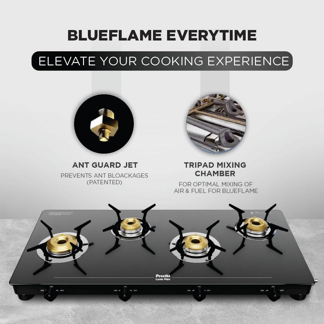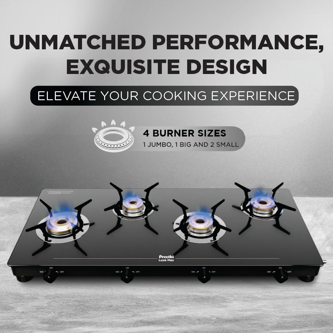Preethi Luxe Max 4 Burner Glass Top Gas Stove With Driptray Less Infinity Design, With Jumbo Burner, 5 Year Warranty on Glass & Burner, Manual Design, Black