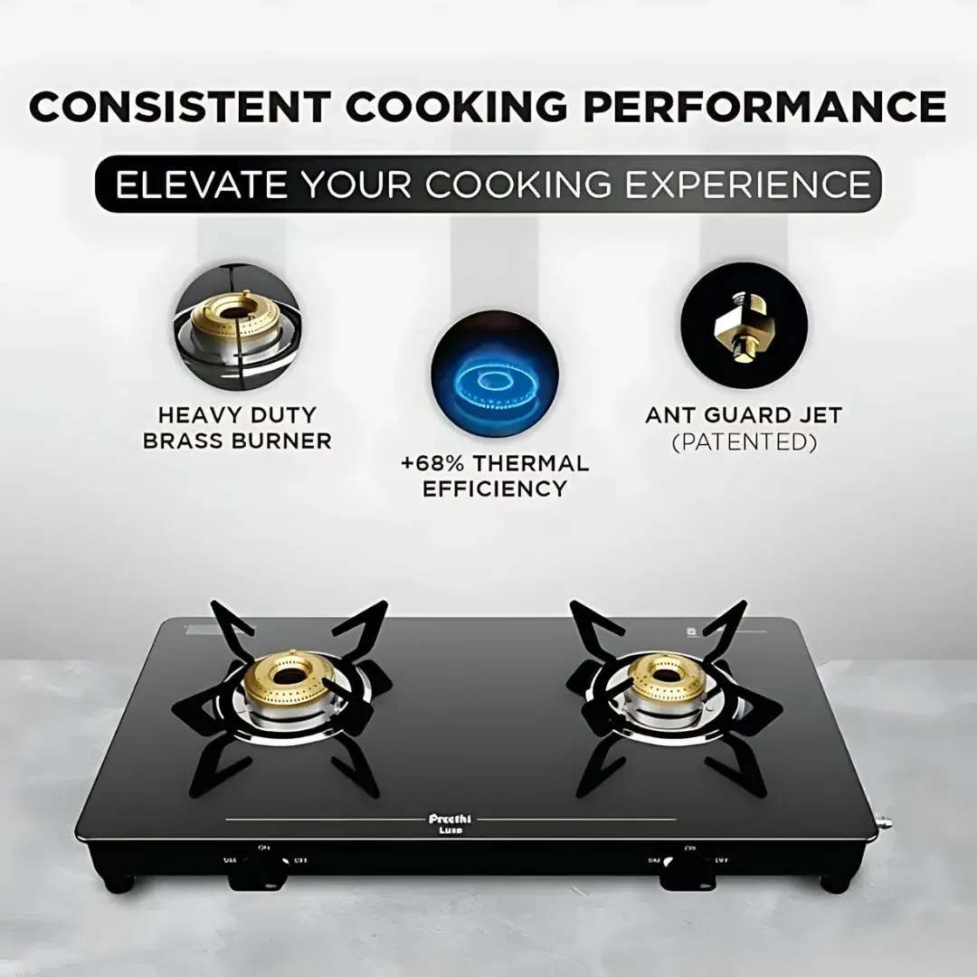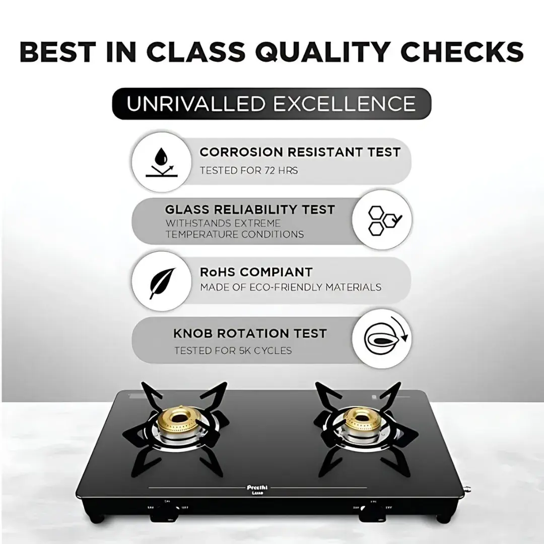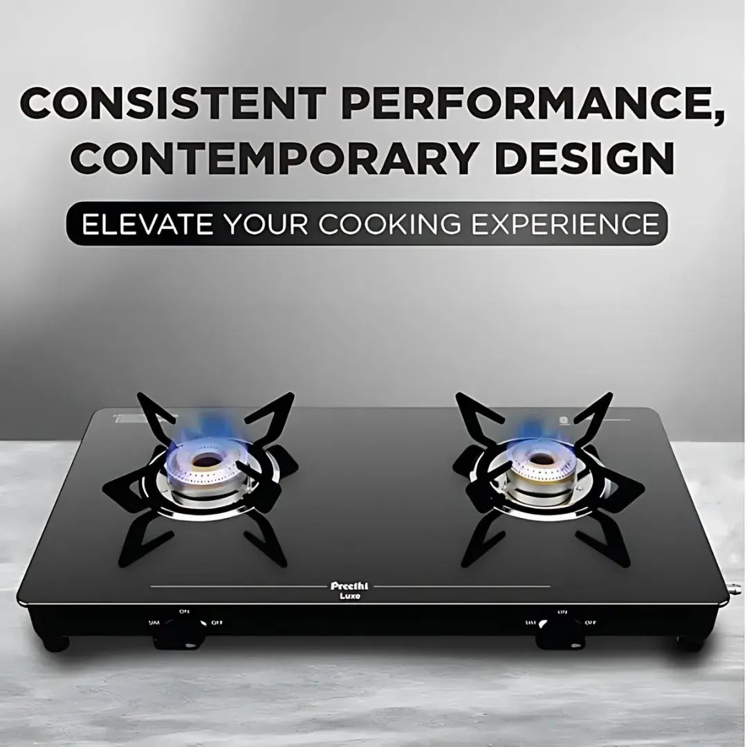 - Overall, the Preethi Luxe Pro Glass Top 2B Gas Stove combines functionality with modern design, making it a popular choice for efficient cooking in contemporary kitchens.