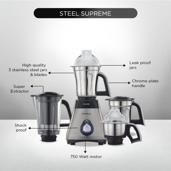 Preethi Steel Supreme mixer grinder, 750 watt (Silver/ Black)