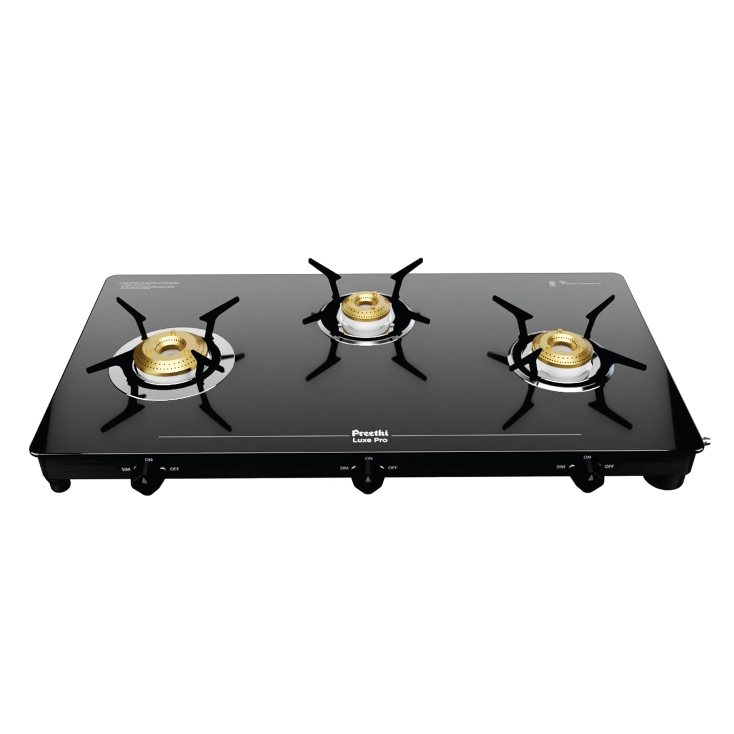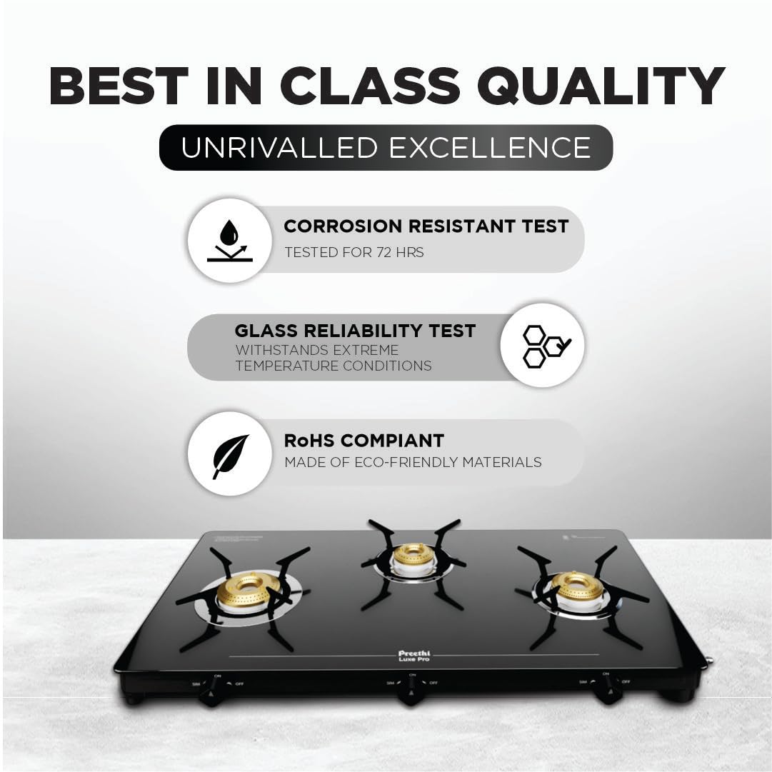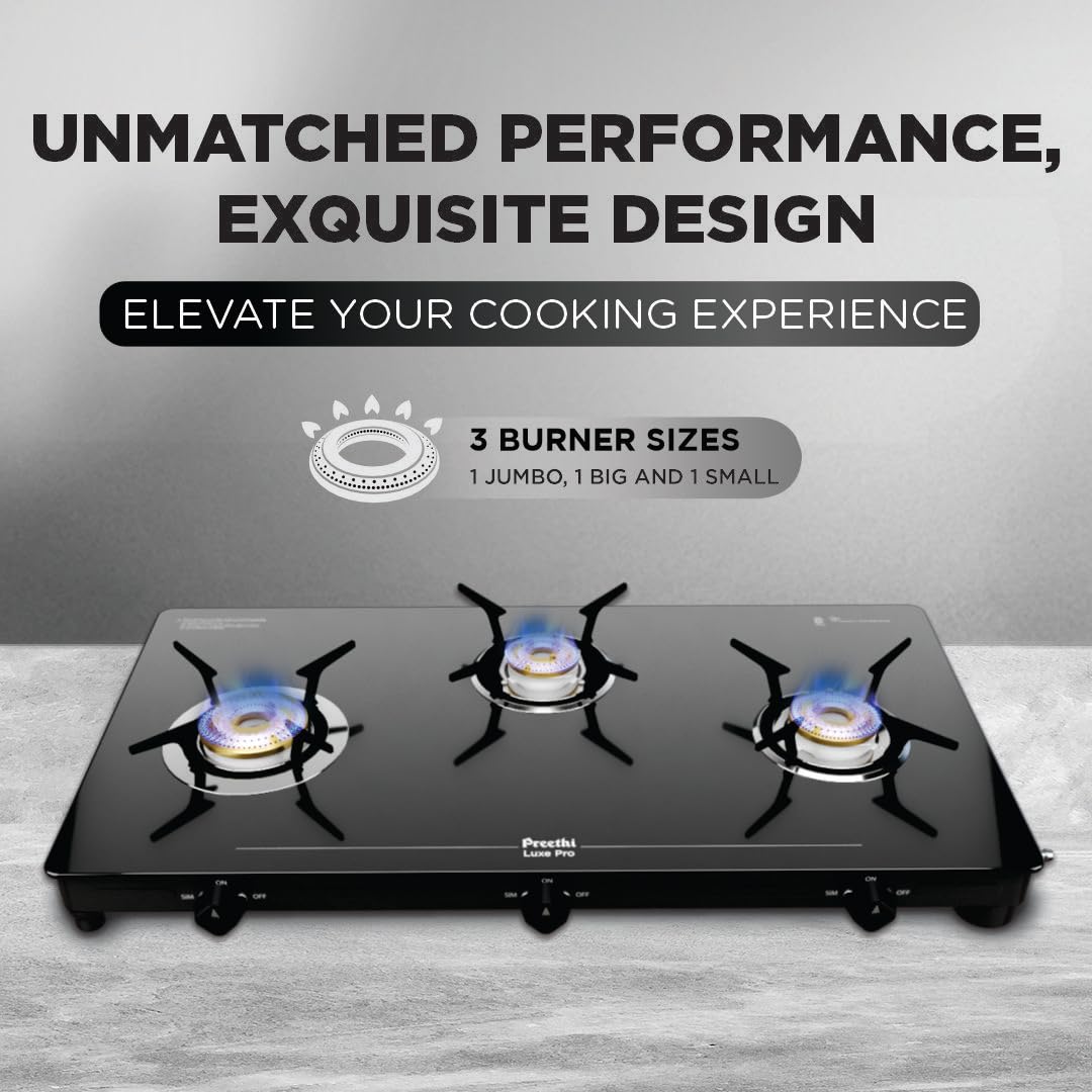 Preethi Tempered Glass Luxe Pro 3 Burner Glass Top Gas Stove With Driptray Less Infinity Design, With Jumbo Burner, 5 Year Warranty On Glass & Burner, Manual Design, Black