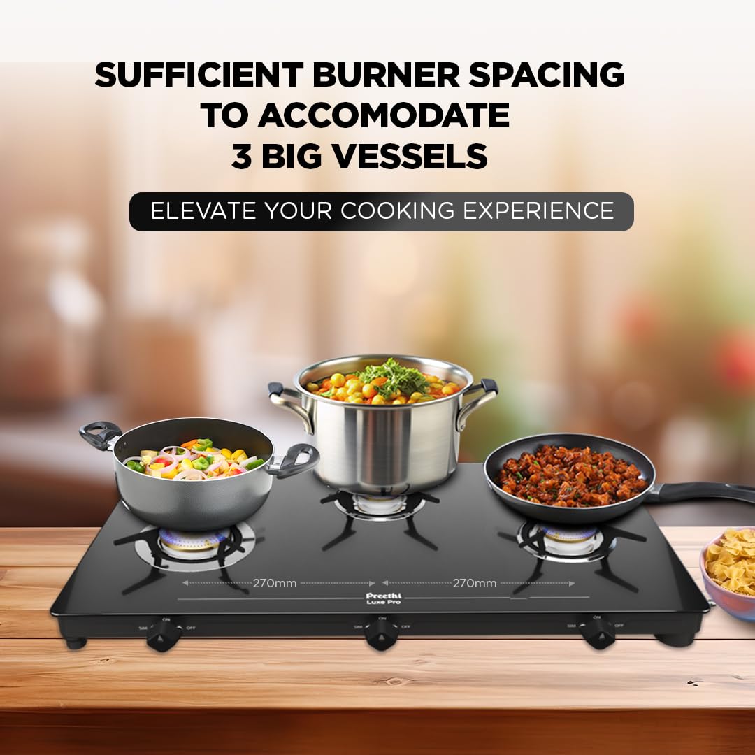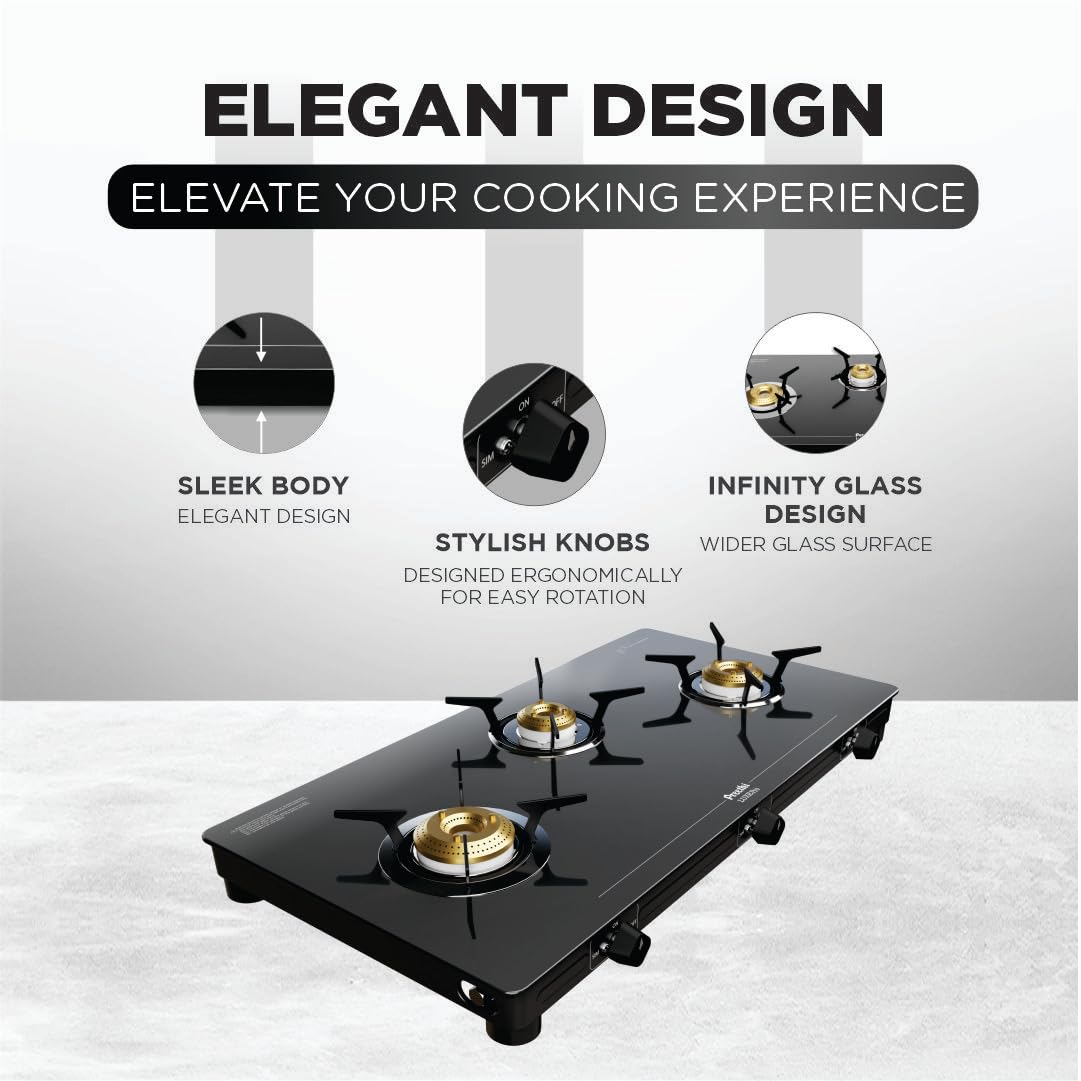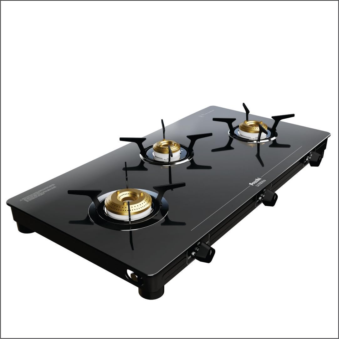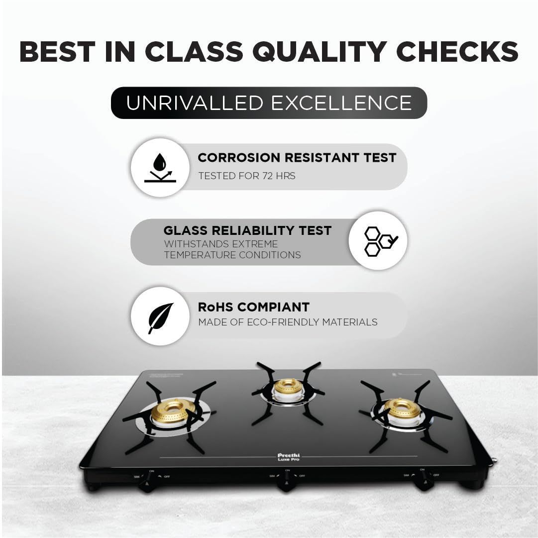 Preethi Tempered Glass Luxe Pro 3 Burner Glass Top Gas Stove With Driptray Less Infinity Design, With Jumbo Burner, 5 Year Warranty On Glass & Burner, Manual Design, Black