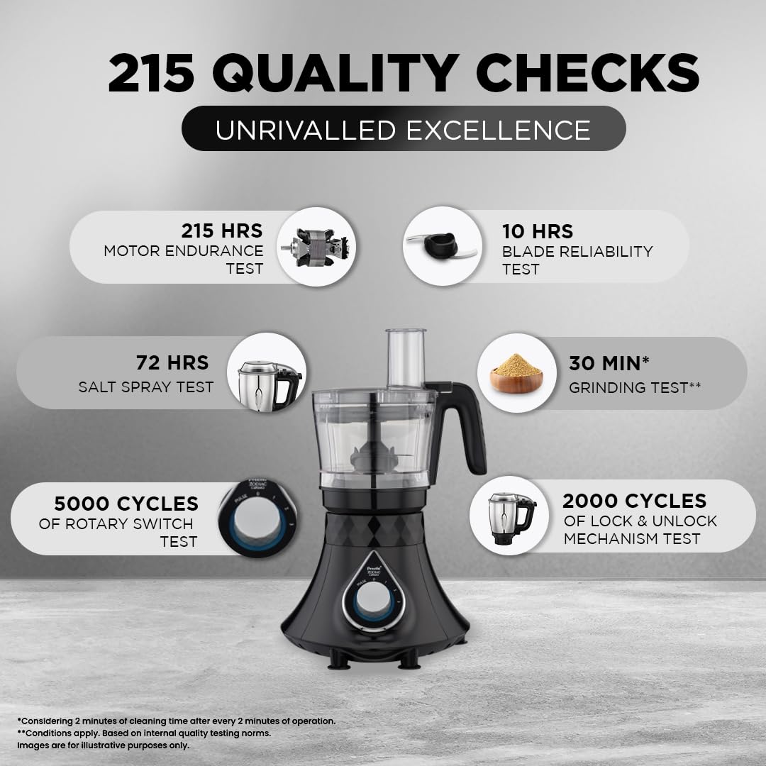 - Master Chef+ Jar for food processing: Cube Cutting, Atta Kneading in 1 min, Chopping in just 2 pulses, Grating and Slicing in seconds, Meat mincing in minutes and Citrus Press, Non-slip Feet.