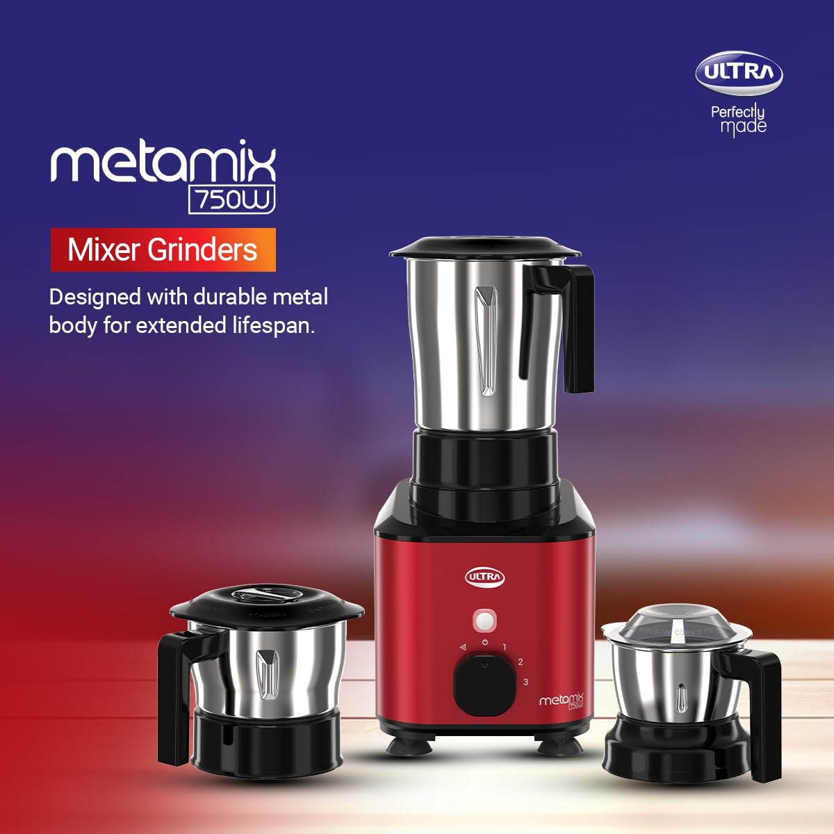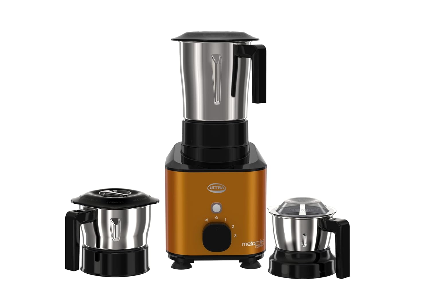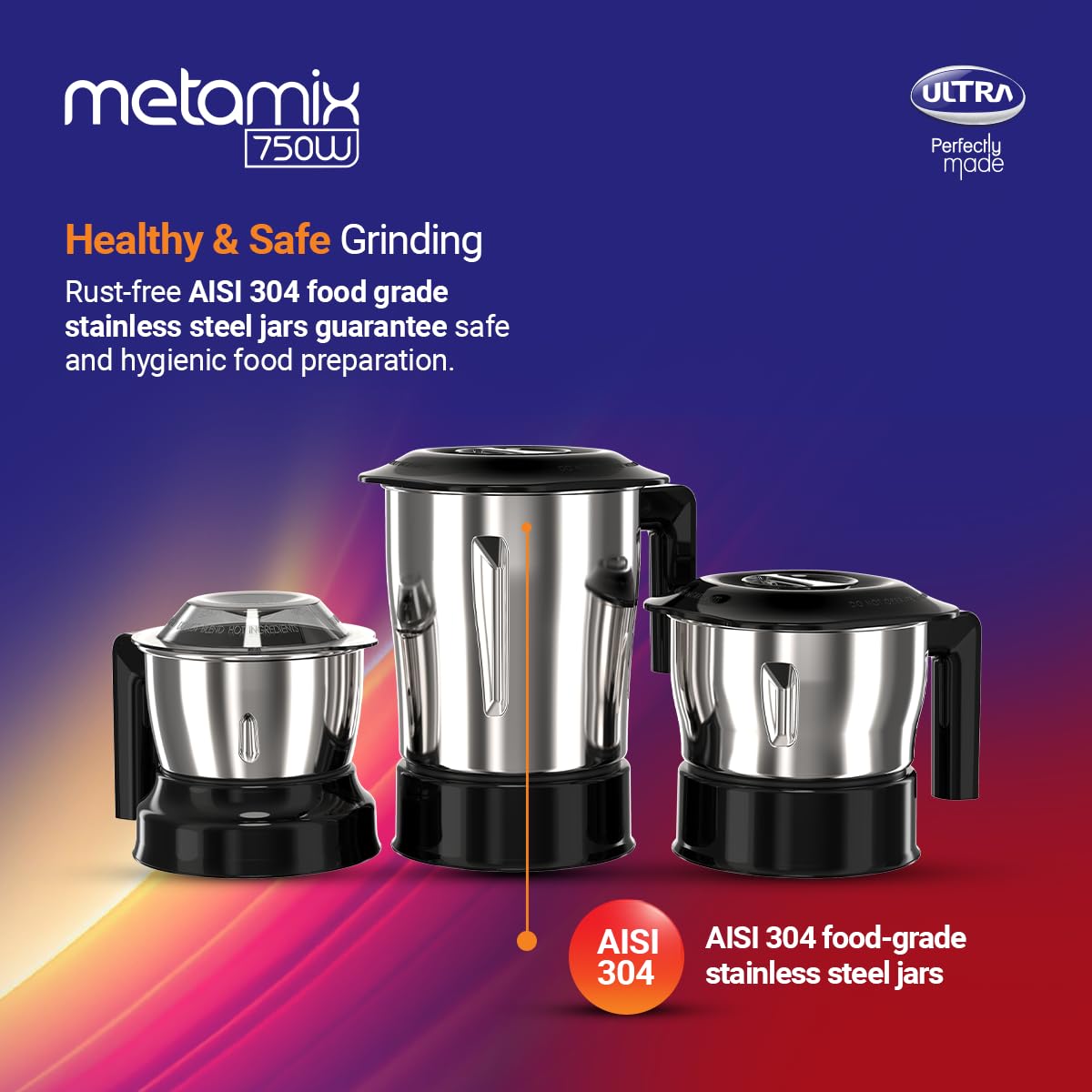 Ultra Metamix 750W 3Jar Mixer Grinder,Candy Yellow for Superfast grinding,High Speed,750 W,Safety Lock,SS304 Food Grade Jars,3 Jars(0.5L 0.8L,1.5L), ABS Body, Serrated blades, 5 Y Warranty on Motors