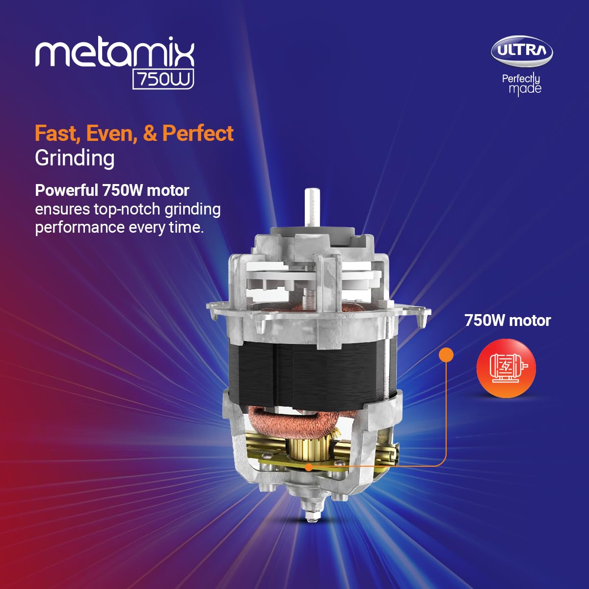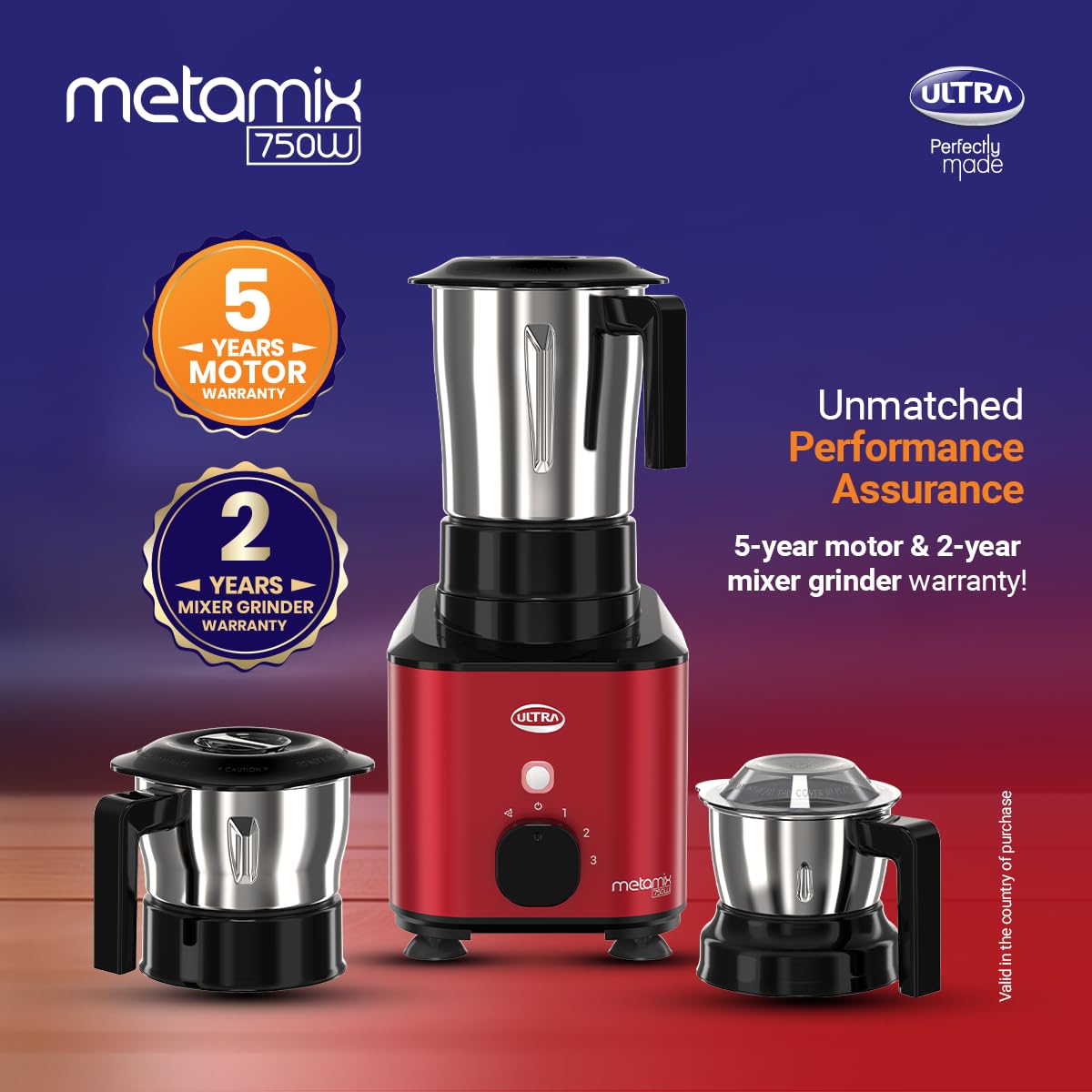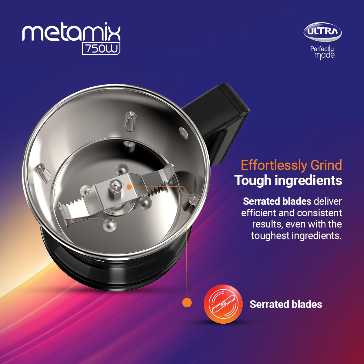 The stunning new Ultra Metamix is thoughtfully designed to be tough outside and powerful inside. You can be assured of long life as the body is made of tough metal. This is complemented by the vibrant appearance, which adds a touch of class to your kitchen. The powerful 750W copper motor, combined with uniquely engineered serrated blades, helps you grind swiftly and evenly for perfect results, every time. The Ultra Metamix is extremely safe to use, as all jars comes with jar interlocking safety feature, which also helps prevent coupler damage. With a long life, powerful performance and high safety, the Ultra Metamix is the perfect choice for your kitchen.