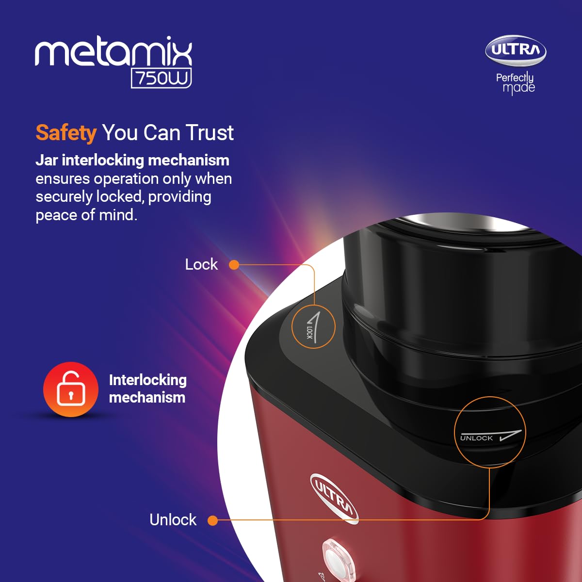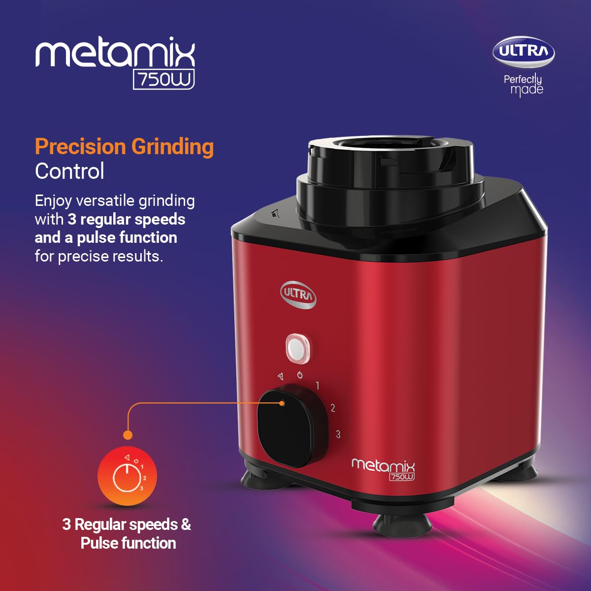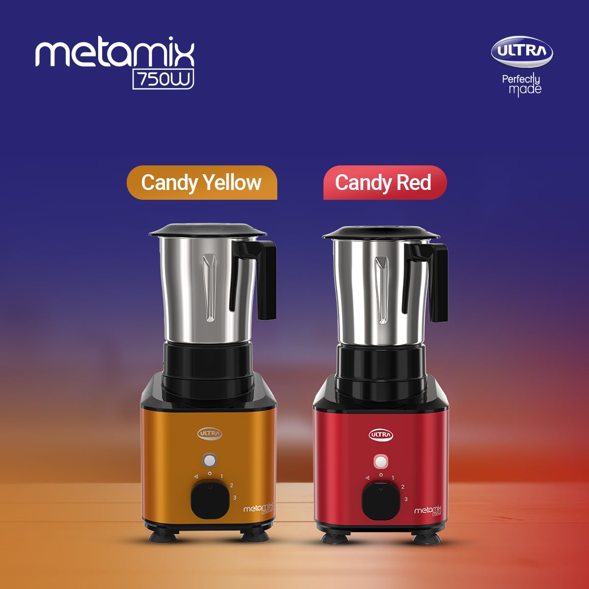 The stunning new Ultra Metamix is thoughtfully designed to be tough outside and powerful inside. You can be assured of long life as the body is made of tough metal. This is complemented by the vibrant appearance, which adds a touch of class to your kitchen. The powerful 750W copper motor, combined with uniquely engineered serrated blades, helps you grind swiftly and evenly for perfect results, every time. The Ultra Metamix is extremely safe to use, as all jars comes with jar interlocking safety feature, which also helps prevent coupler damage. With a long life, powerful performance and high safety, the Ultra Metamix is the perfect choice for your kitchen.