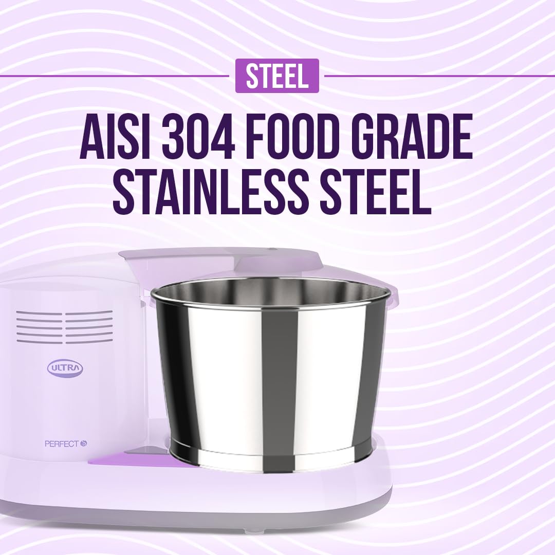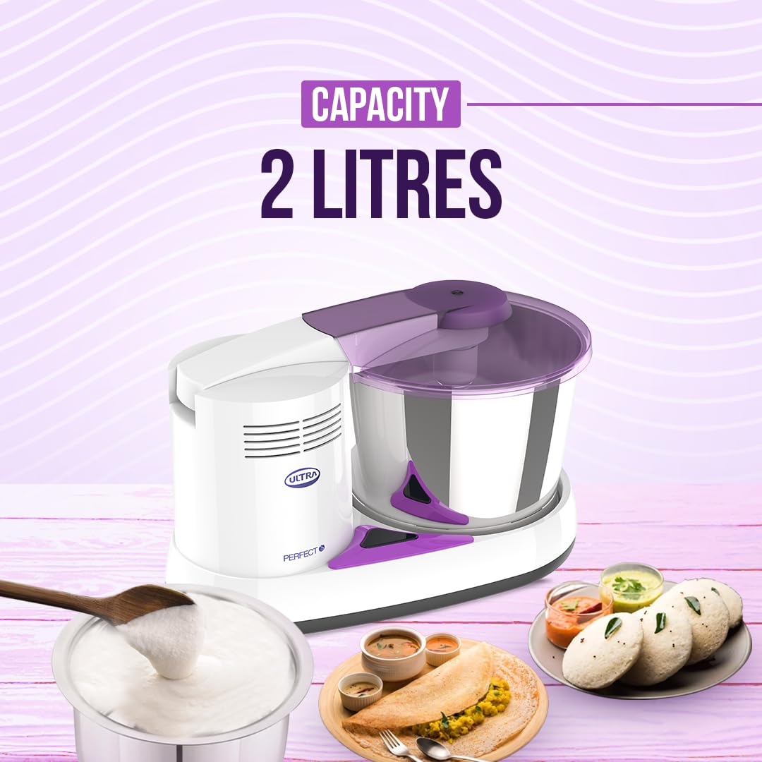 Ultra Perfect S 2 Litre Table Top Wet Grinder – White | Fast Grinding Conical Stones, 150W Motor & 5 Years Warranty | AISI 304 Food-Grade SS Multi Utility Dish-Type Drum | Light Weight, CE Certified