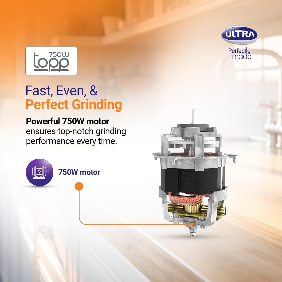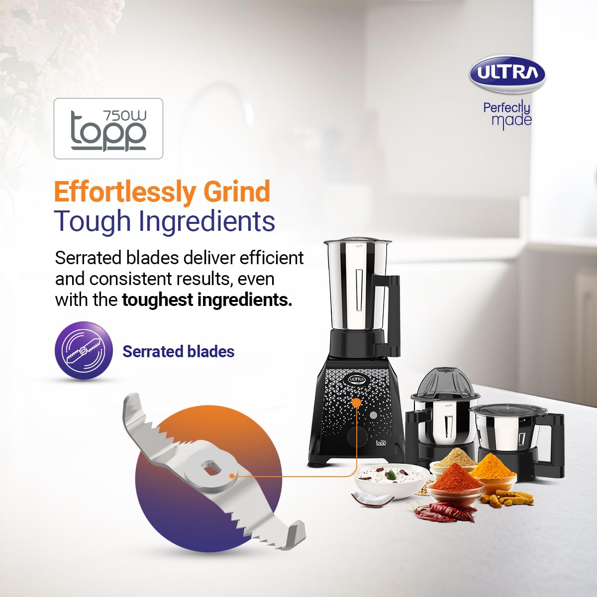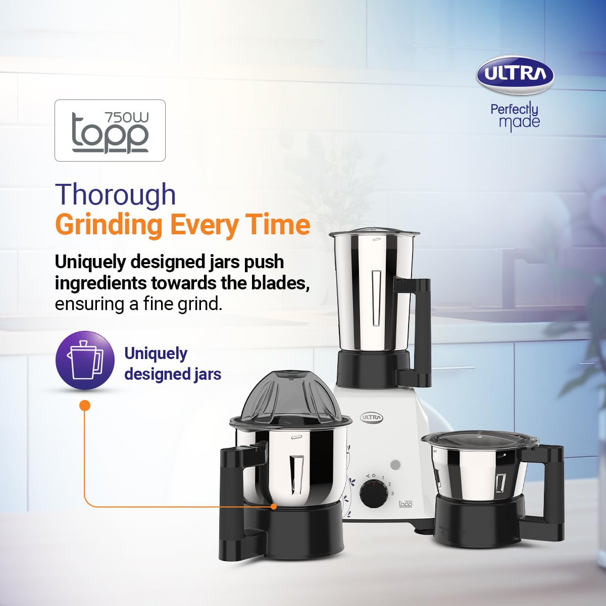 Ultra Topp Mixer Grinder – Blue | Fast and Heavy-Duty Grinding – 750W Motor with 5 Years Warranty | AISI 304 Food-Grade 3 Stainless Steel Jar – ABS Body, 3 Speed Regular + Pulse