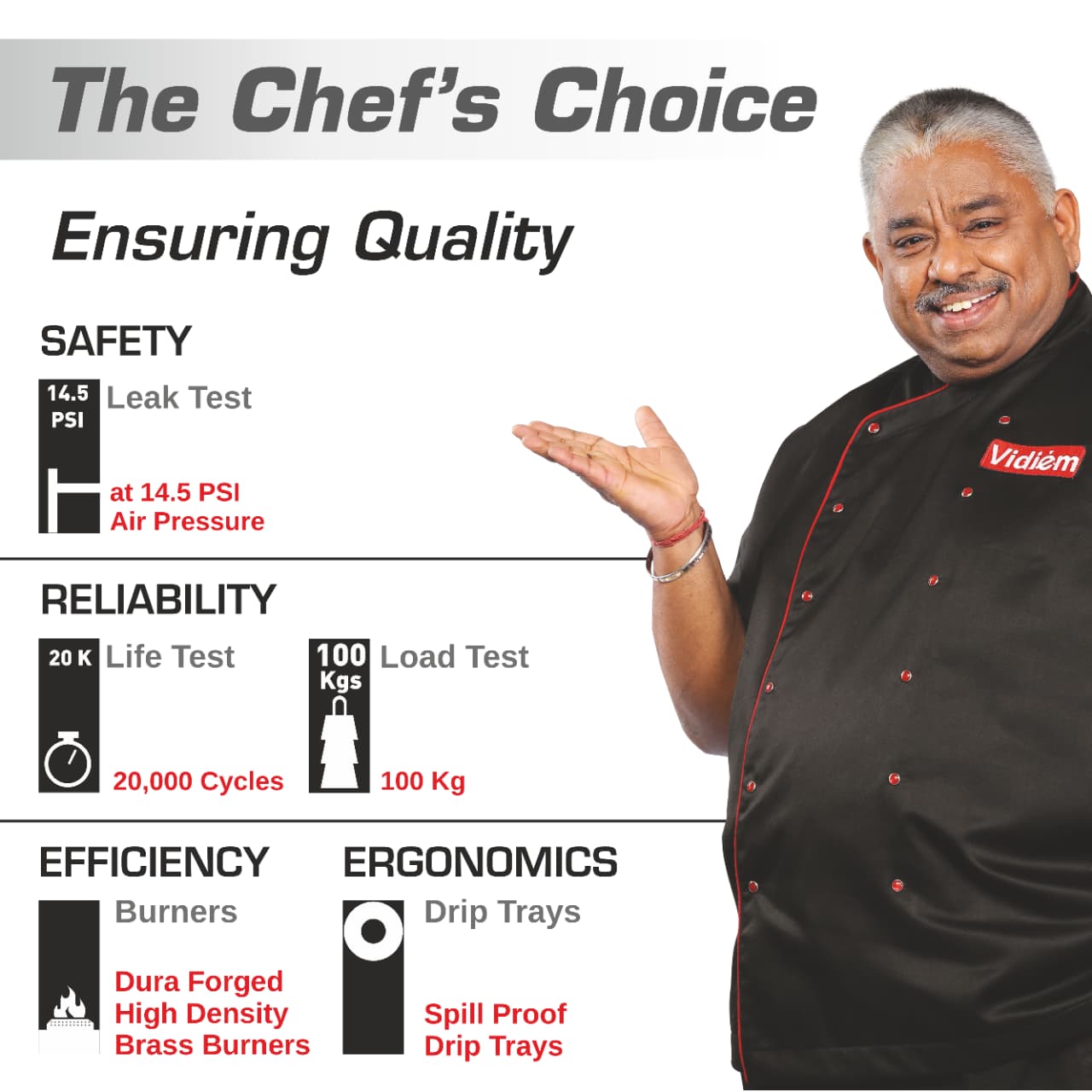 - Vidiem Tusker 2mm High Gloss SS Body , Extra Large Cooking Surface & Widely Spaced Burners to accommodate Large Vessels with Jumbo, Medium & Small Dura Forged Brass Burners.