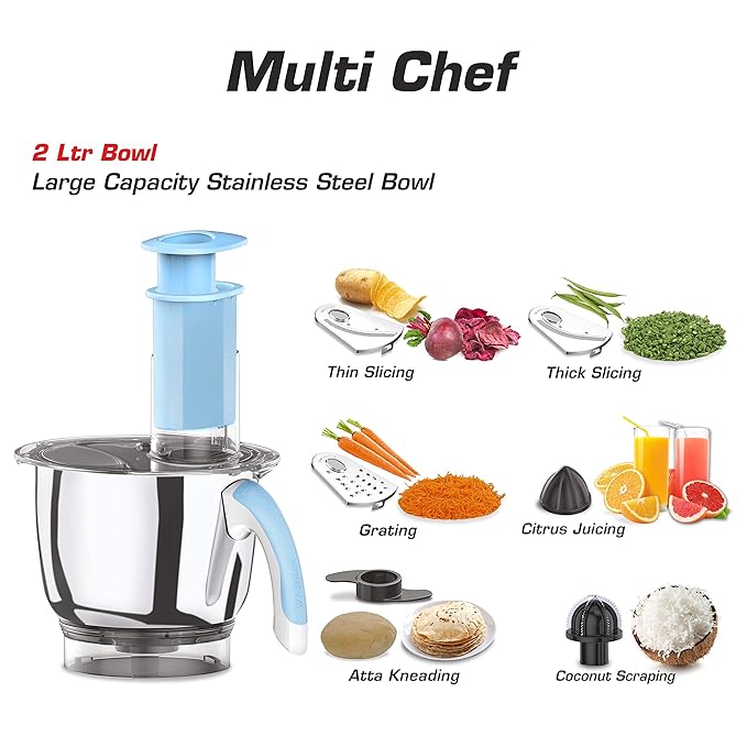 - Vidiem IRIS ADC – Your All Day Companion – Grinding, Grating, Thick & Thin Slicing, Coconut Scrapping , Atta Kneading, Citrus Juicing… 2 Litre Stainless Steel Multi Chef with Polycarbonate Lid.