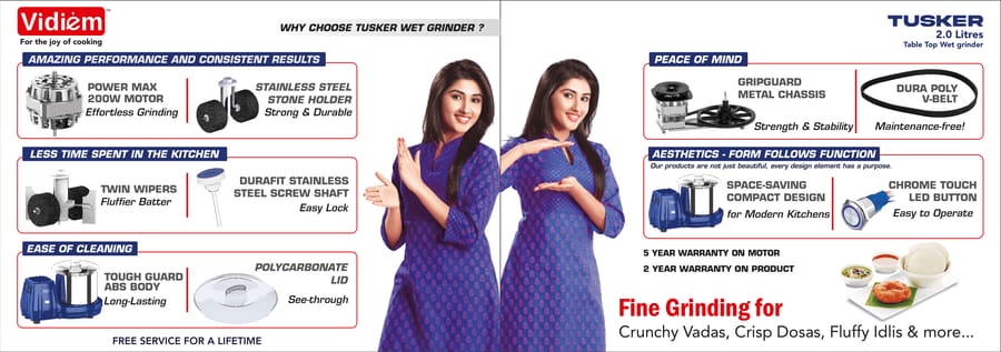 Twin Wipers ensure softer, fluffier batter with more air — perfect for idlis, dosas, and vadas.