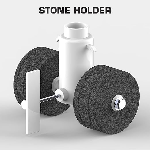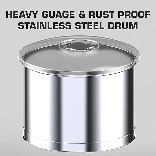 - Heavy Gauge Rust Proof Stainless Steel Drum with Precision Machined Stone Base & Extra Wide Stone Rollers.